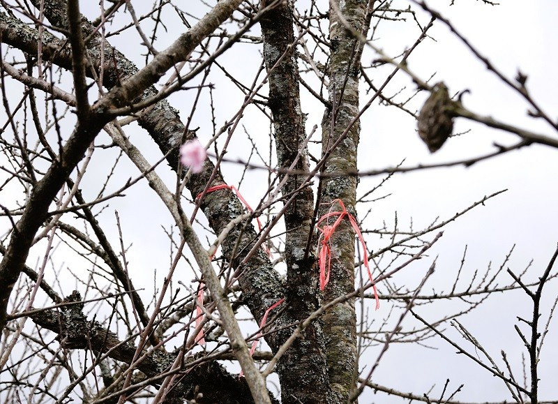 Những cành đào được buộc dây màu hồng, màu đỏ là những cành đã được khách đặt mua.