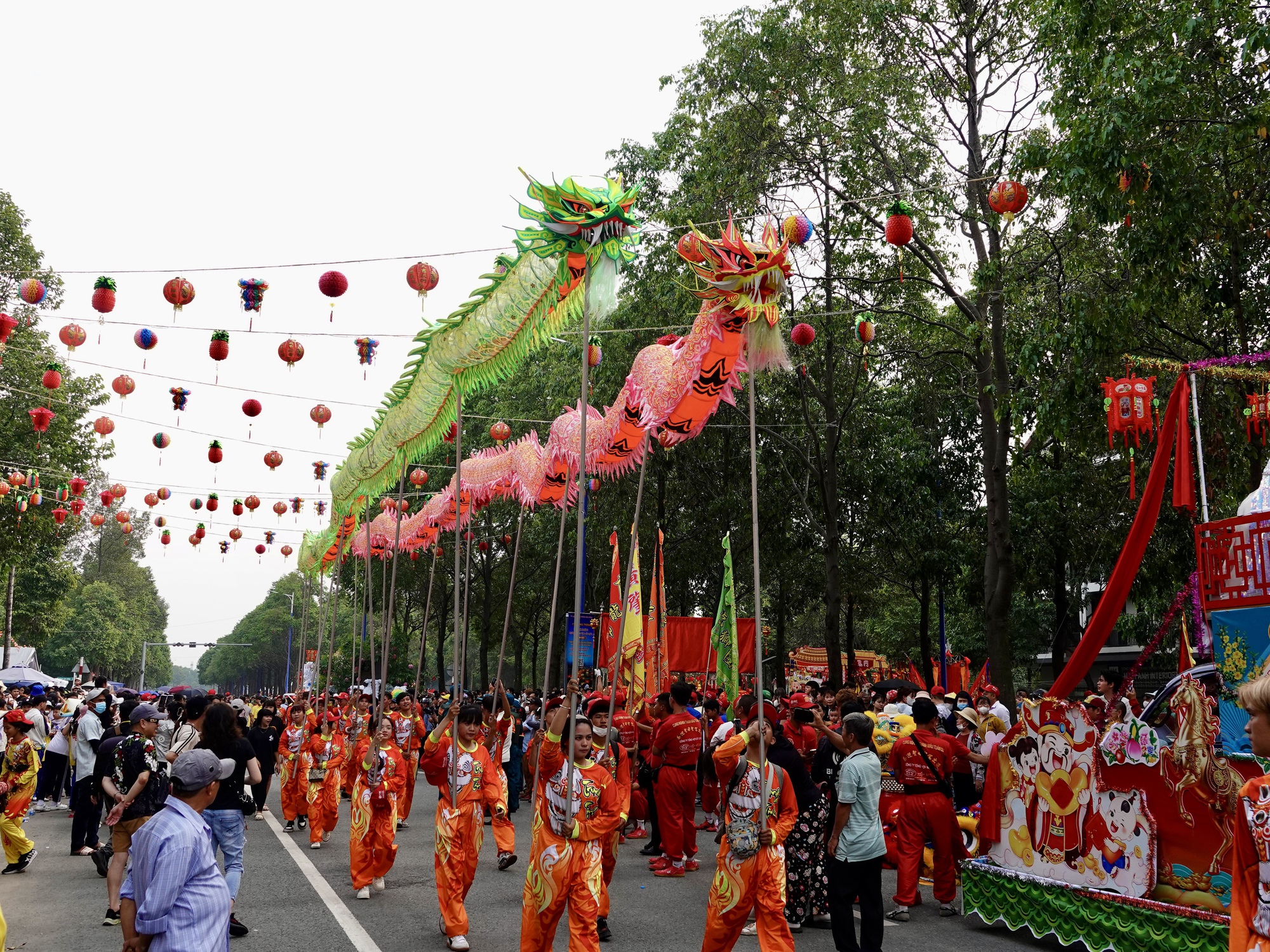 Năm nay, lễ hội quy tụ hơn 25 đoàn lân sư rồng trong tỉnh, cùng các đoàn xe hoa, đội hình biểu diễn nghệ thuật và gánh cờ hoa của Tiên đồng Ngọc nữ đến từ 4 bang người Hoa tại thành phố Thủ Dầu Một. Tất cả hòa vào nhau tạo nên một không gian lễ hội vừa linh thiêng vừa sôi động.