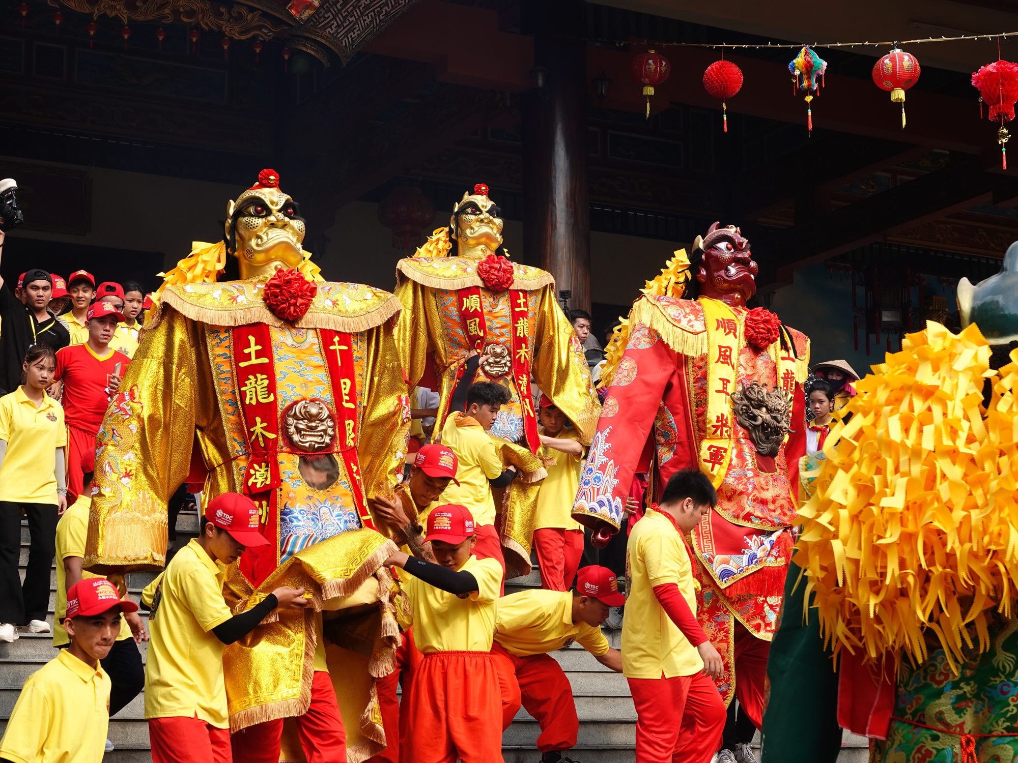 Những nhân vật linh thiêng này di chuyển qua các tuyến phố trong tiếng reo hò, tiếng trống lân rộn rã