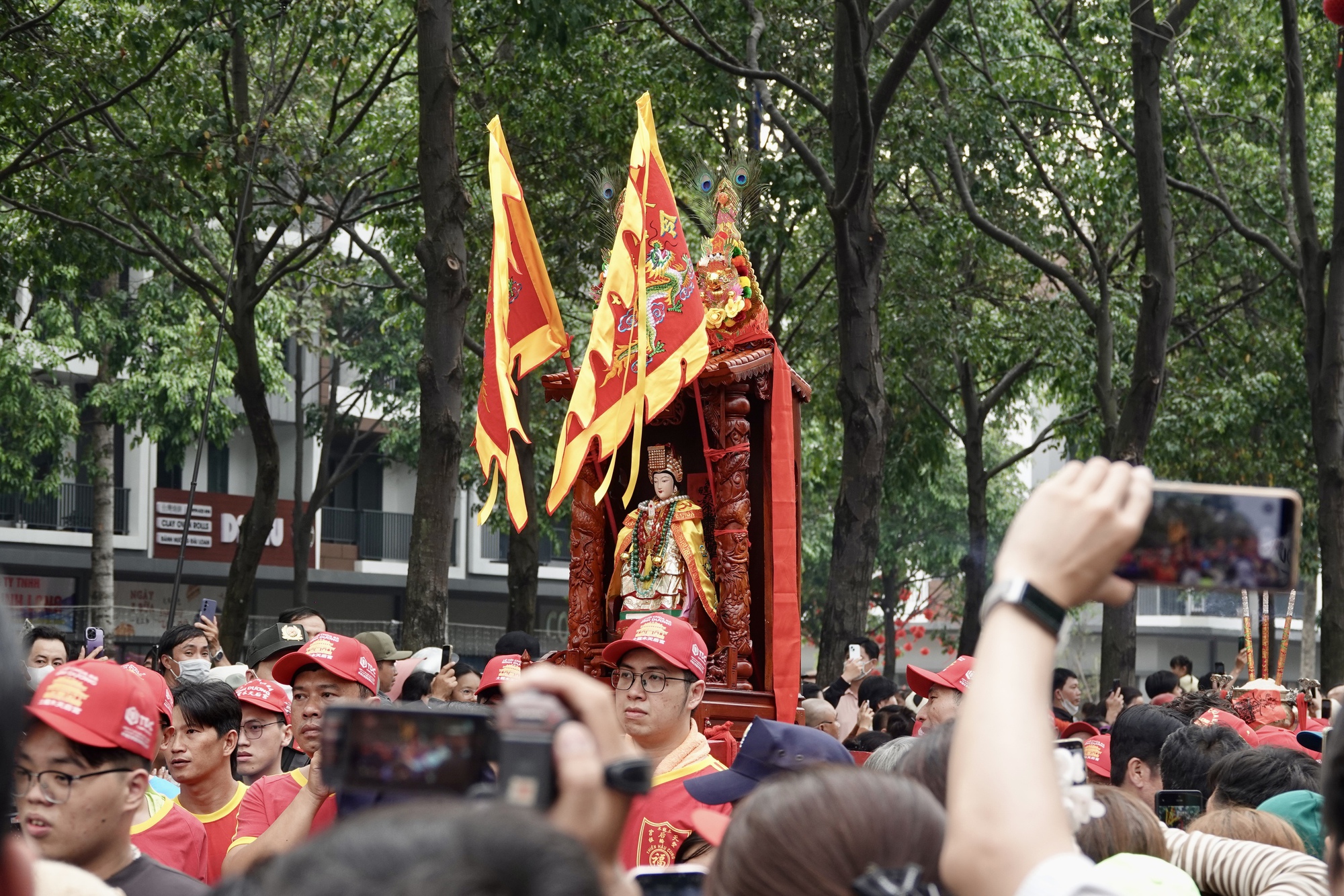 Tượng Bà Thiên Hậu Thánh Mẫu được rước trang trọng giữa vòng vây chào đón của đông đảo người dân