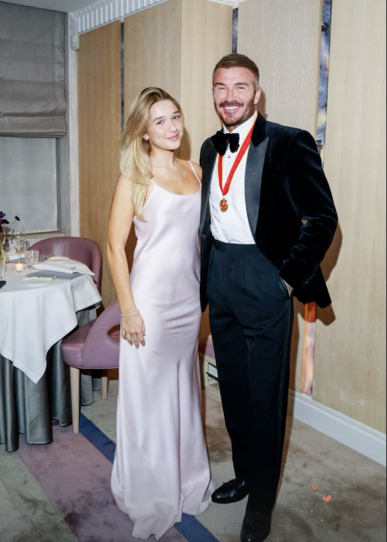 Cạnh bên Harper là người cha danh thủ, vừa được phong tước Hiệp sĩ. David Beckham diện tuxedo nhung đen lịch lãm, đeo huân chương danh dự trên cổ - hình ảnh vừa tự hào vừa ấm áp khi sánh vai cùng con gái út. Nhiều bình luận khen ngợi Harper trông như "công chúa nhỏ của Sir Beckham", hoàn toàn xứng đáng với danh xưng "rich kid đẹp nhất nhì nước Anh".