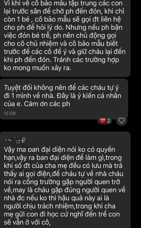 Trước ý kiến trên, Ban đại diện cha mẹ học sinh lớp đã giải thích rằng những vấn đề liên quan đến việc đưa đón, giữ trẻ và xử lý tình huống an toàn của học sinh thuộc thẩm quyền của giáo viên chủ nhiệm và bảo mẫu. Ban đại diện chỉ đóng vai trò phối hợp hoạt động phong trào, không phải bộ phận quản lý chuyên môn hay chịu trách nhiệm trực tiếp đối với học sinh sau giờ học.