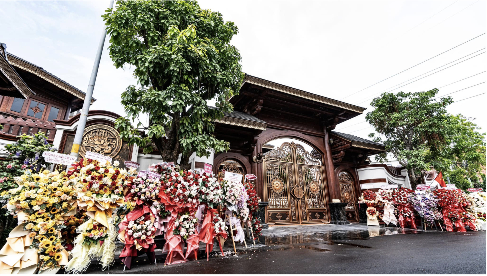 Ngoài cổng chất đầy hoa tươi chúc mừng