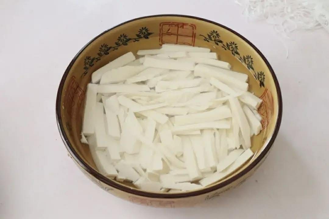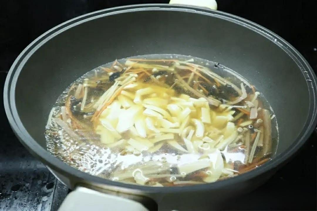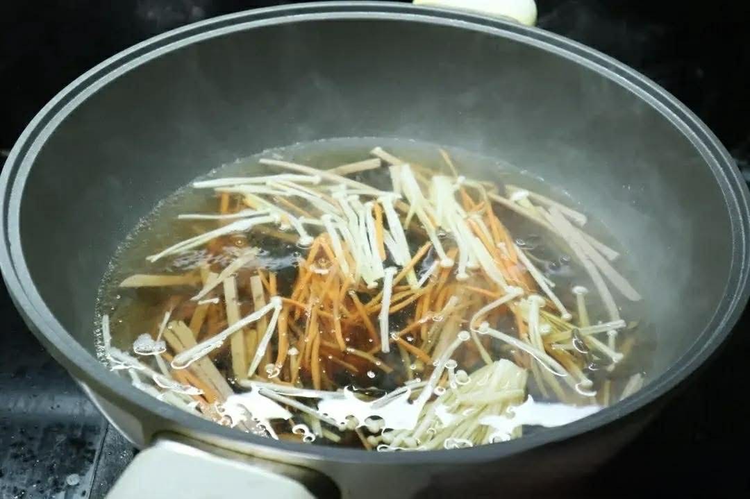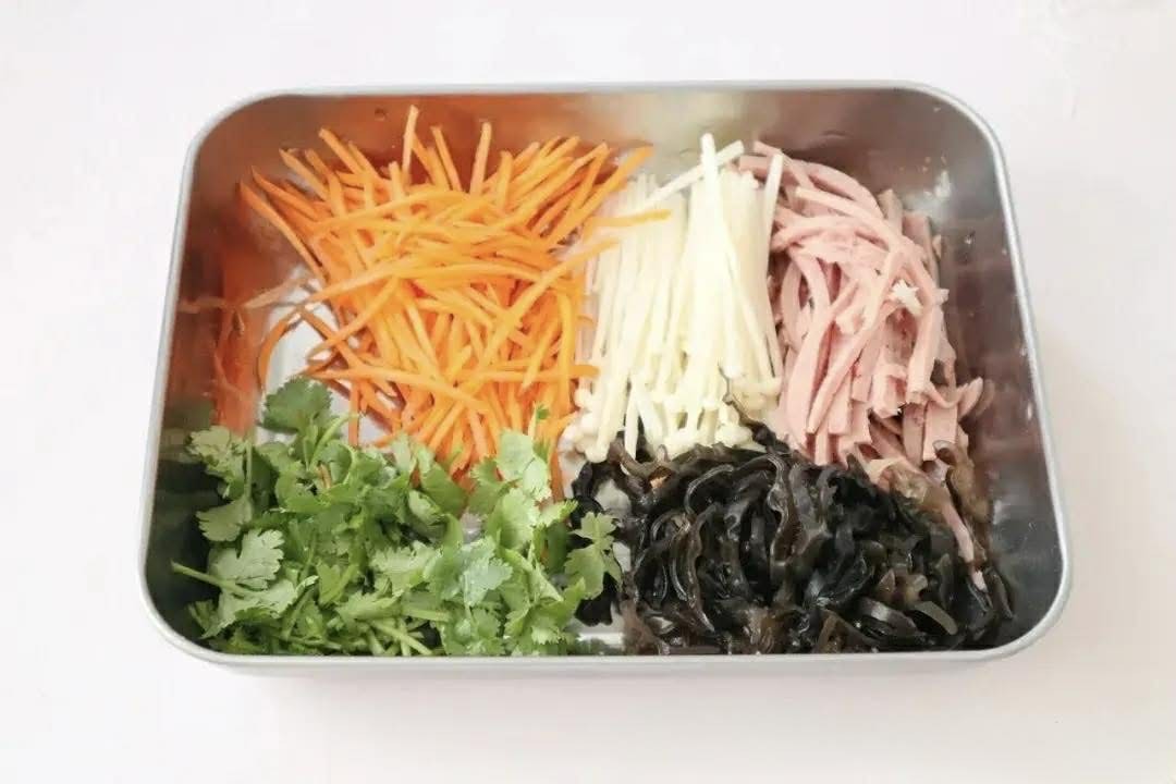 Bước 1: Mộc nhĩ ngâm trước cho nở mềm rồi rửa sạch sau đó thái thành sợi nhỏ. Cà rốt đem gọt bỏ vỏ, rửa sạch rồi thái sợi. Thái thịt nguội thành các miếng dạng sợi. Cắt bỏ chân nấm kim châm, sau đó rửa sạch rồi cắt nấm kim châm làm 2 phần. Đậu phụ non cắt thành dạng sợi, sau đó nhẹ nhàng cho vào nồi nước sôi chần qua để khử mùi đậu (có thể thêm chút muối).
