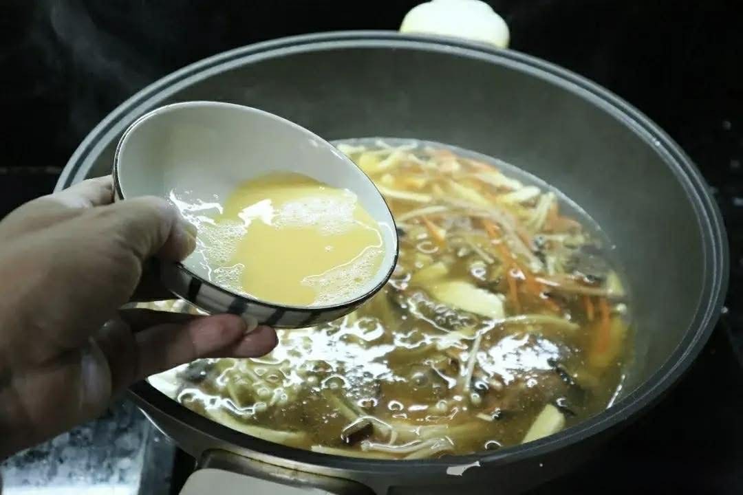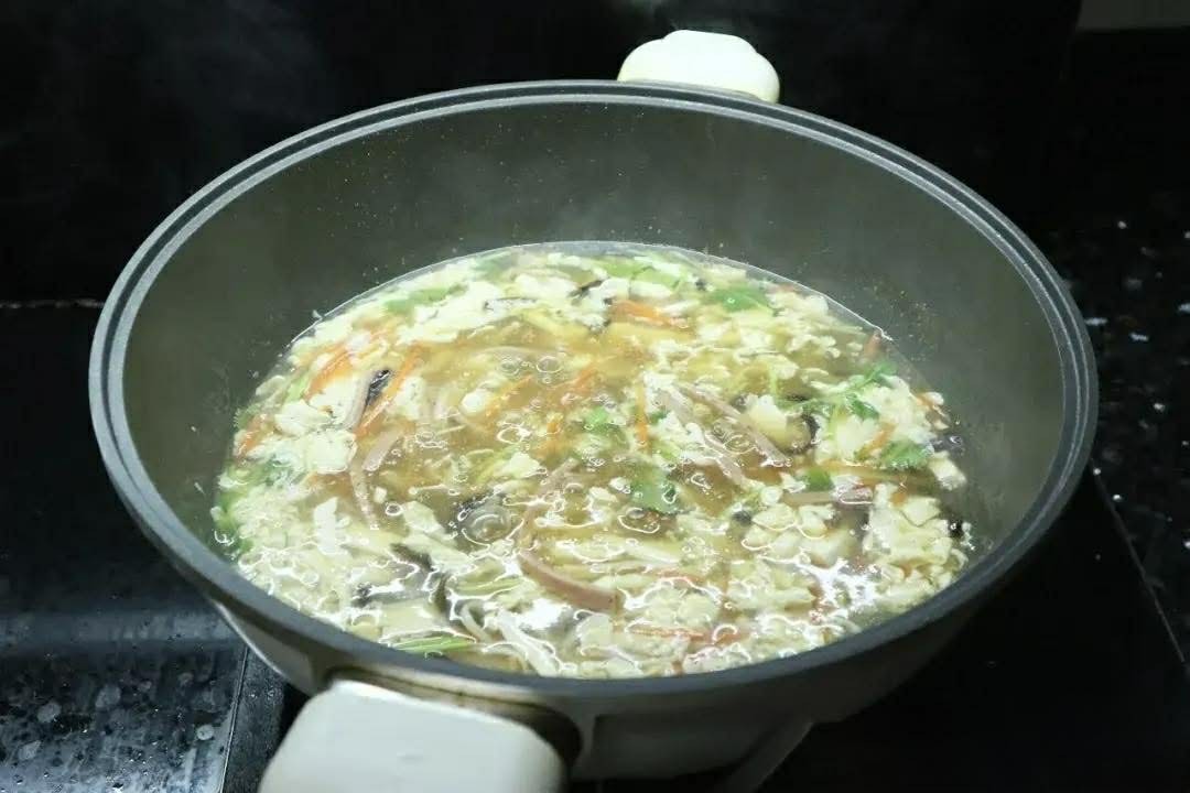 Bước 3: Chuẩn bị chiếc bát nhỏ, cho 1.5 thìa bột bắp vào cùng với chút nước, khuấy đều. Sau khi nồi canh sôi, bạn chỉnh nhỏ lửa rồi từ từ cho bột bắp vừa pha vào, khuấy nhẹ nhàng để phần nước dùng sánh lại. Tiếp theo bạn đổ trứng đã đánh tan vào. Mục đích của việc làm đặc nước dùng trước là để vân trứng đánh tan nổi lên trên chứ không chìm xuống đáy. Cuối cùng, thêm vài giọt dầu mè và tinh chất cốt gà để nêm nếm, rắc rau mùi lên trên. Lúc này, hãy nhớ nêm nếm lại vị chua cay một lần nữa, vì vị chua cay sẽ bay hơi một chút trong quá trình nấu. Nếu chưa đủ, bạn có thể thêm vào.