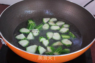 Bước 2: Đun sôi nước trong nồi. Khi nước sôi, cho vài lát gừng vào, sau đó thả mướp vào. Khi mướp mềm, dùng đũa gắp các lát thịt đã ướp vào và đảo nhanh để chúng không bị dính vào nhau. Khi các lát thịt đổi màu, thêm gia vị và một ít nước dùng gà để nêm nếm, rắc hành lá thái nhỏ lên trên, và món ăn đã sẵn sàng để thưởng thức.