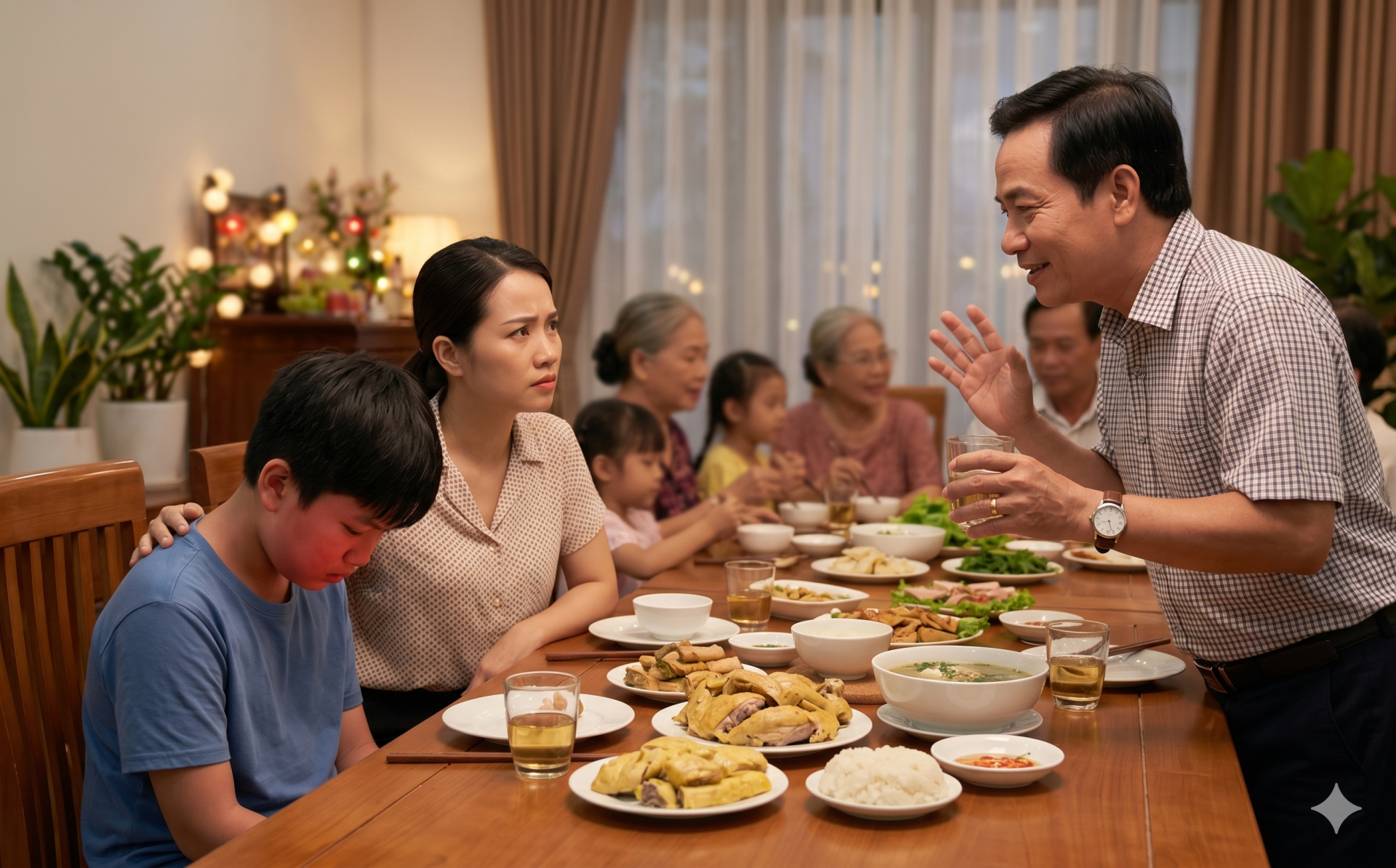 Theo lời chia sẻ, trong bữa tiệc liên hoan đông đủ họ hàng, một người bác đã chủ động tiến đến phía con trai chị để hỏi han. Ban đầu, không khí tưởng chừng rất ấm áp với câu hỏi cửa miệng: "Thế năm vừa rồi học hành như nào hả cháu?" . Khi cậu bé thật thà và lễ phép đáp lại: "Dạ, cháu học cũng bình thường thôi ạ" , thì "màn kịch" thực sự mới bắt đầu.