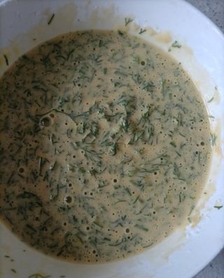 Rửa sạch rồi băm nhỏ rau thì là, cho vào tô rồi thêm trứng, bột mì, bột tôm và 2g muối, trộn đều để tạo thành hỗn hợp bột sền sệt. Cho một ít dầu vào chảo, đổ hỗn hợp bột vào và dàn đều thành bánh kếp tròn. Chiên cho đến khi vàng nâu cả hai mặt.