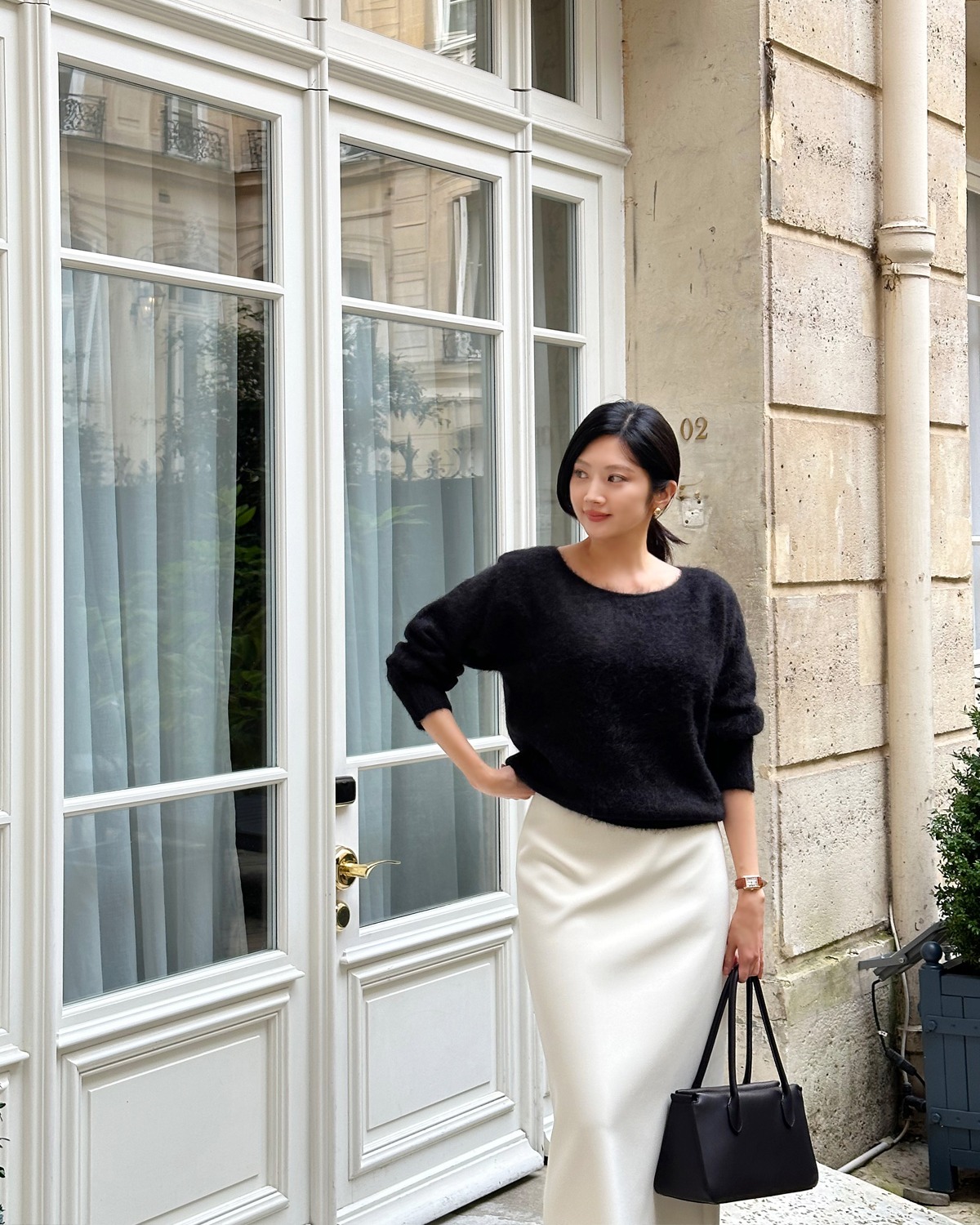 Để tăng hiệu quả hack dáng, bạn có thể áp dụng cách phối đồ ton-sur-ton với quần hoặc chân váy cùng gam màu tối. Sự liền mạch về màu sắc sẽ giúp kéo dài vóc dáng, tạo cảm giác cao và gầy hơn. Nếu không muốn outfit quá đơn điệu, bạn có thể thêm phụ kiện sáng màu như túi xách, giày hoặc khăn choàng để tạo điểm nhấn mà vẫn giữ được sự thanh thoát.