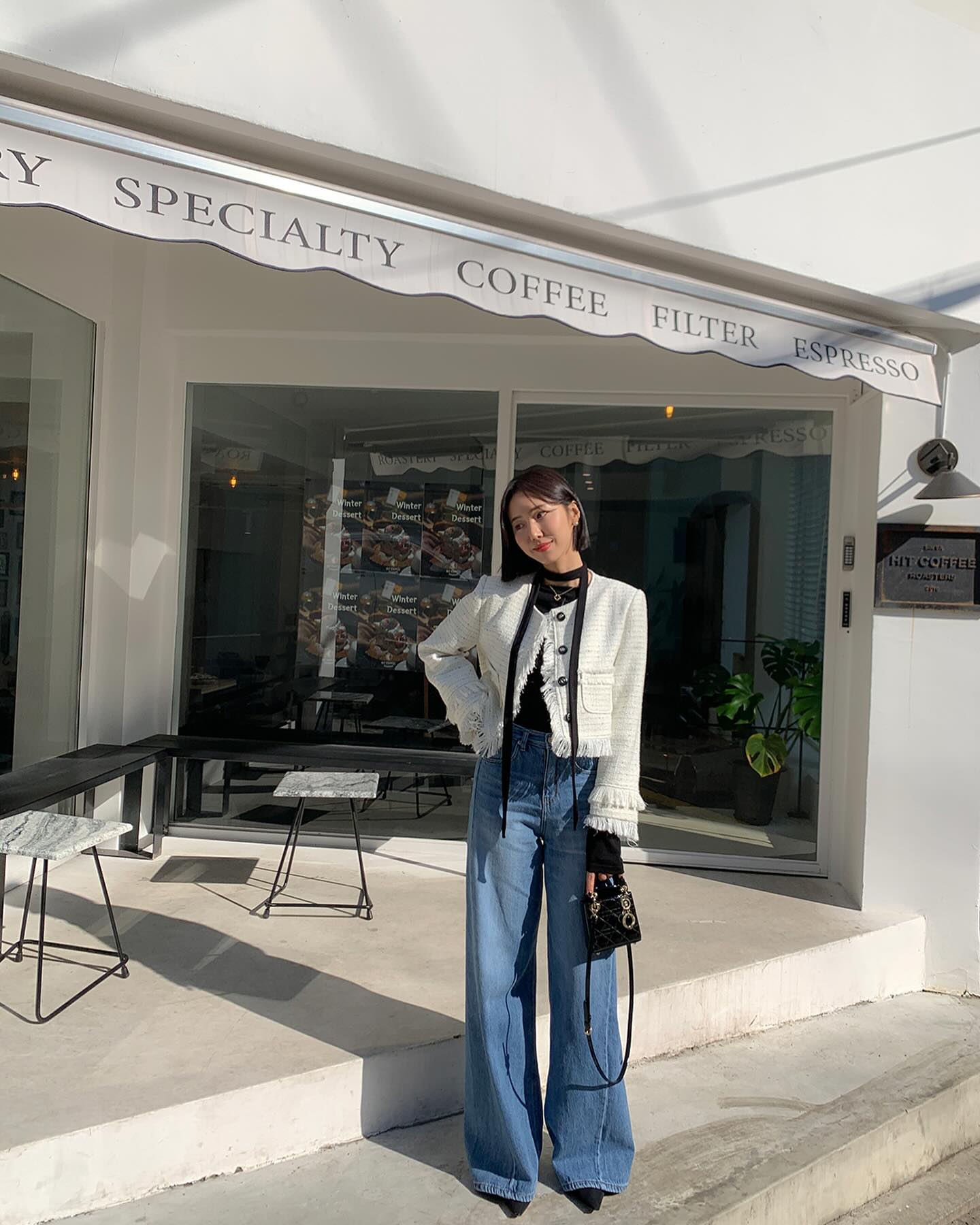 Áo khoác vải tweed là một lựa chọn không thể thiếu nếu bạn muốn tạo ra một phong cách thanh lịch nhưng vẫn có phần cá tính. Sự kết hợp giữa quần jeans và áo khoác vải tweed mang đến một vẻ ngoài đầy ấn tượng, vừa mạnh mẽ nhưng không kém phần tinh tế.