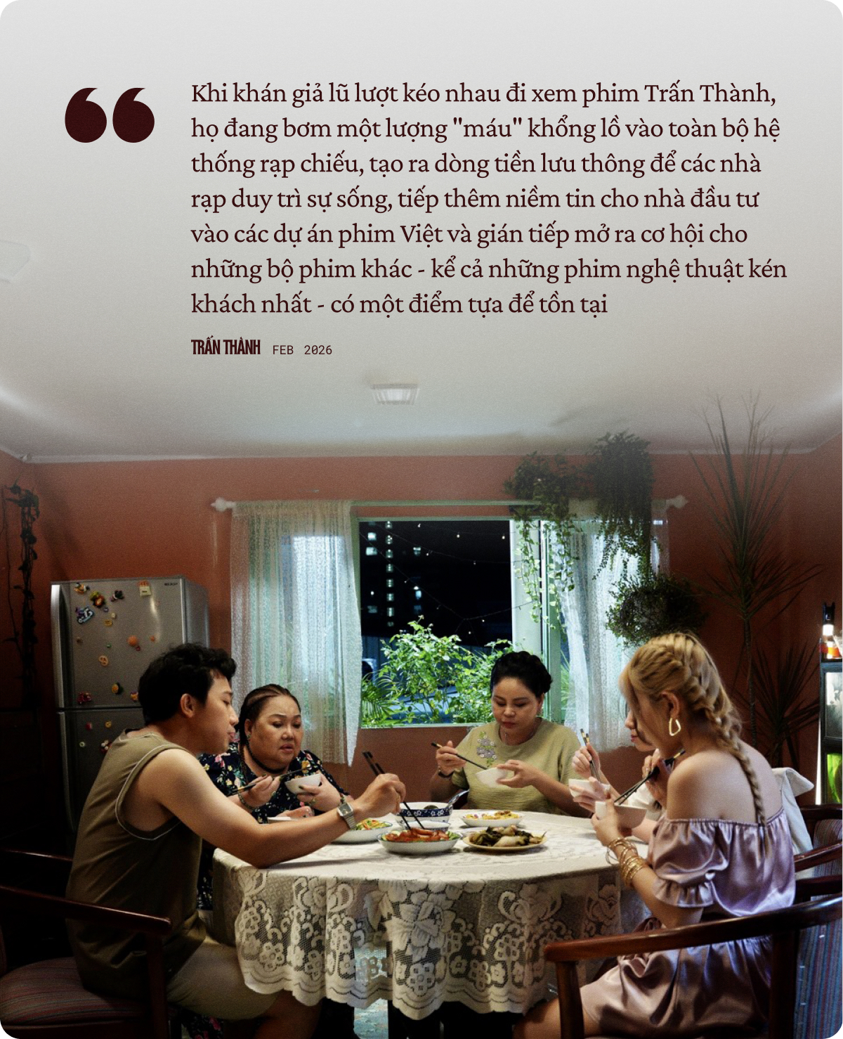 Việc các tác phẩm ra mắt sau liên tiếp "vượt mặt" và phá vỡ kỷ lục của tác phẩm trước không đơn thuần là sự may mắn, đó là một sự thống trị về mặt thị hiếu. Giữa những khoảng trống mênh mông của các dự án bị đắp chiếu hay những bộ phim rời rạp trong im lặng, phim của Trấn Thành hiện lên như một sự kiện văn hóa không thể bỏ lỡ. Anh không chỉ bán vé- anh đang tái lập thói quen ra rạp cho một bộ phận khổng lồ công chúng. Khi khán giả lũ lượt kéo nhau đi xem phim Trấn Thành, họ đang bơm một lượng "máu" khổng lồ vào toàn bộ hệ thống rạp chiếu, tạo ra dòng tiền lưu thông để các nhà rạp duy trì sự sống, tiếp thêm niềm tin cho nhà đầu tư vào các dự án phim Việt và gián tiếp mở ra cơ hội cho những bộ phim khác - kể cả những phim nghệ thuật kén khách nhất - có một điểm tựa để tồn tại.