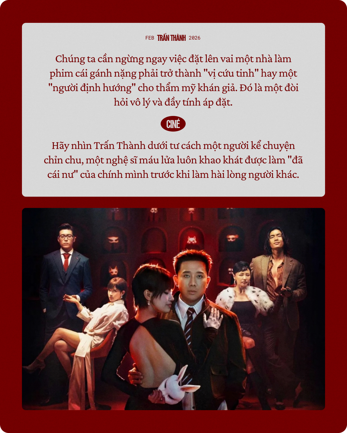 Có vẻ như đám đông đang đặt lên vai Trấn Thành một gánh nặng mà anh chưa từng ký kết: Gánh vác tương lai và đạo đức nghề nghiệp của cả một nền điện ảnh. Nhưng hãy thành thật với nhau: Trấn Thành không có nghĩa vụ phải là vị cứu tinh của điện ảnh Việt, cũng càng không phải là một nhà giáo dục thẩm mỹ nghệ thuật. Anh chỉ đơn giản là một đạo diễn có đủ khả năng để tự làm phim thỏa mãn cái "nư" sáng tạo của chính mình.