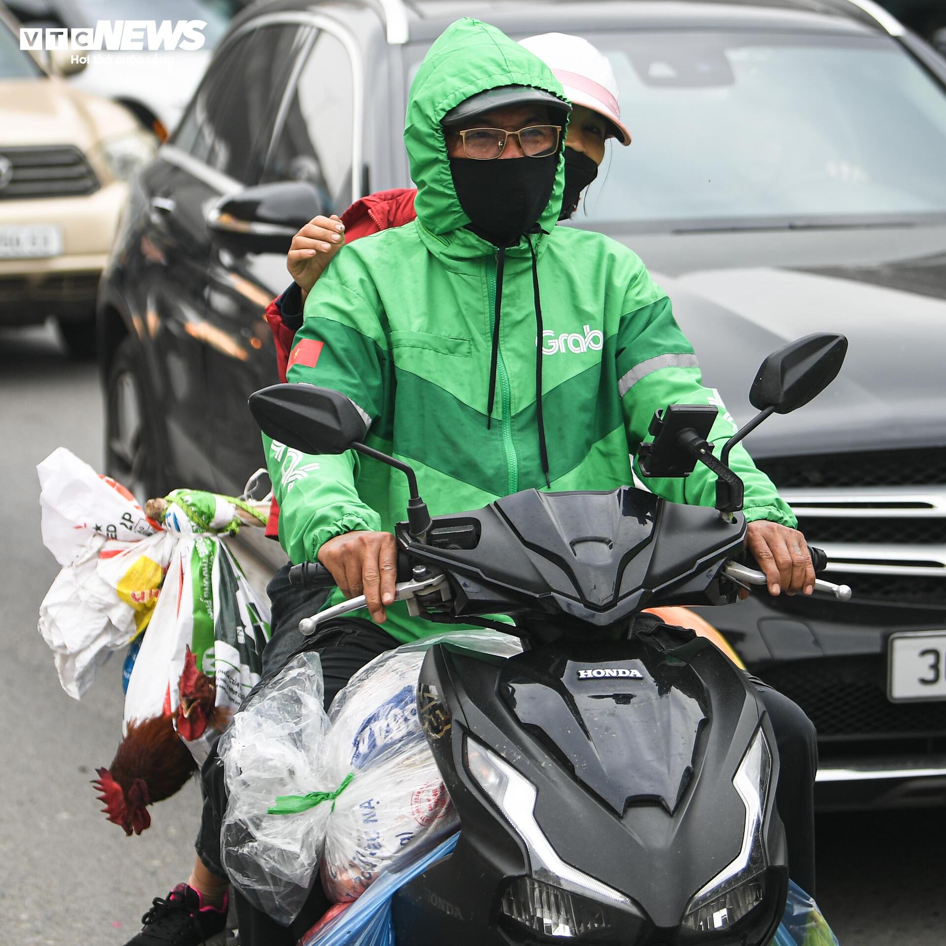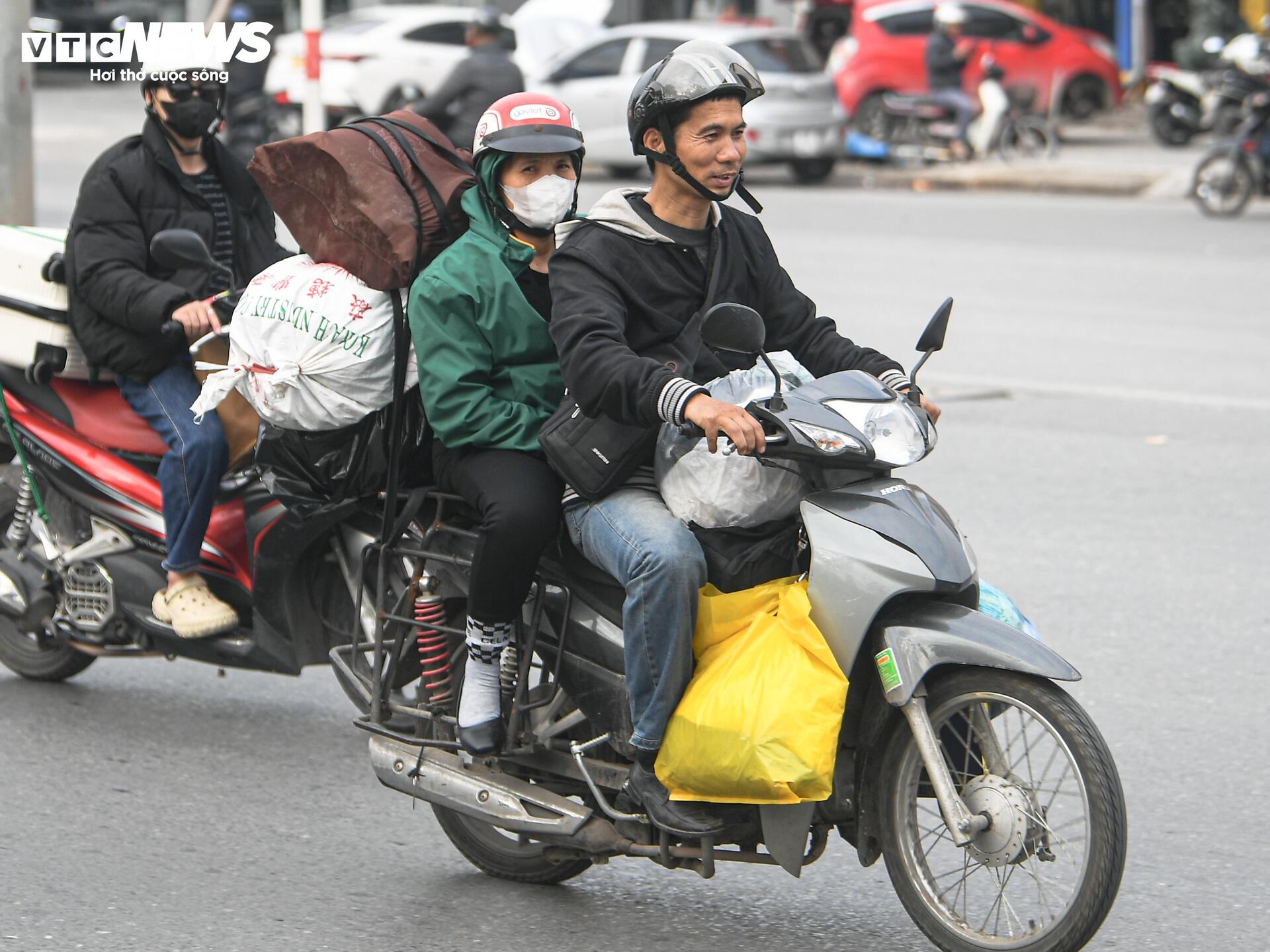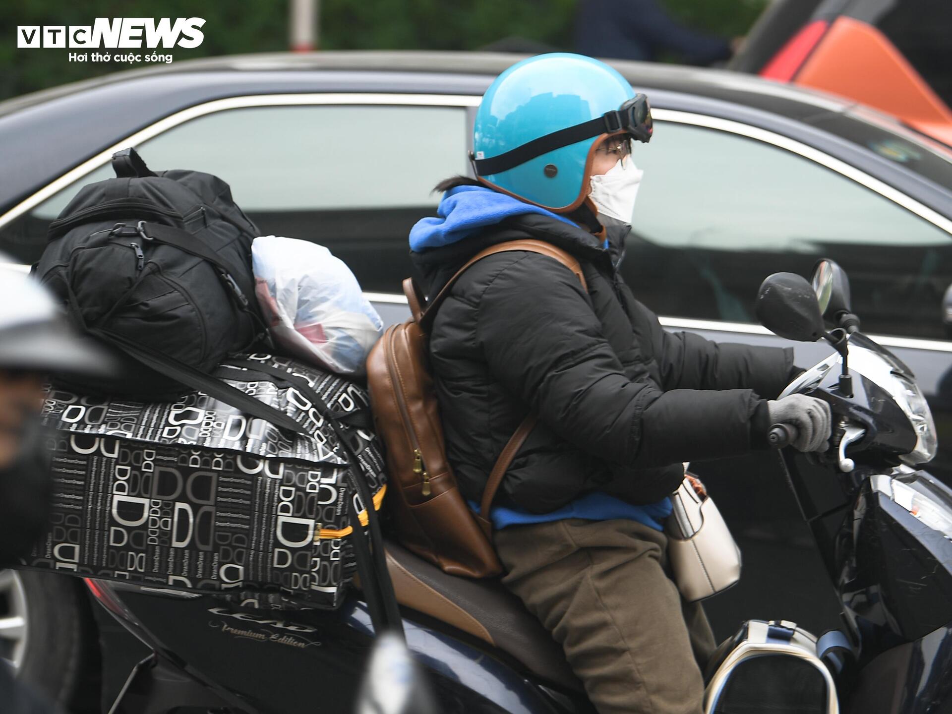 Chị Thanh Mai (42 tuổi) cùng chồng mang theo vali quần áo, quà Tết để về Ninh Bình. “Kết thúc buổi sáng là chúng tôi di chuyển luôn để kịp về nhà trong tối nay. Đường đông hơn mọi ngày nên đi chậm, nhưng ai cũng muốn về sớm để chuẩn bị Tết”, chị Mai chia sẻ.