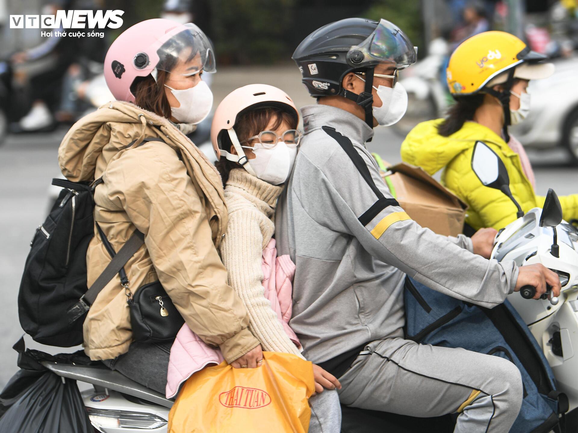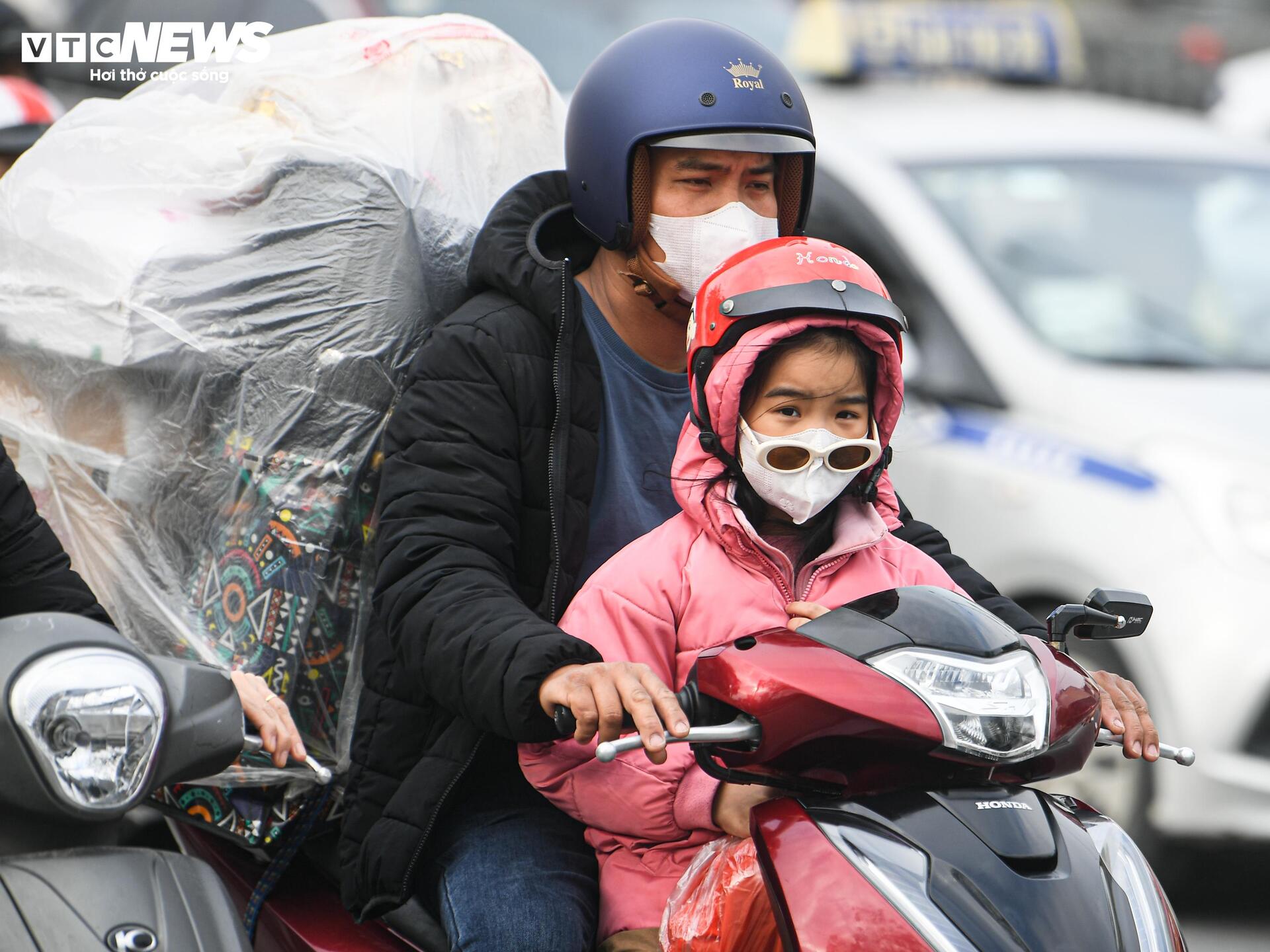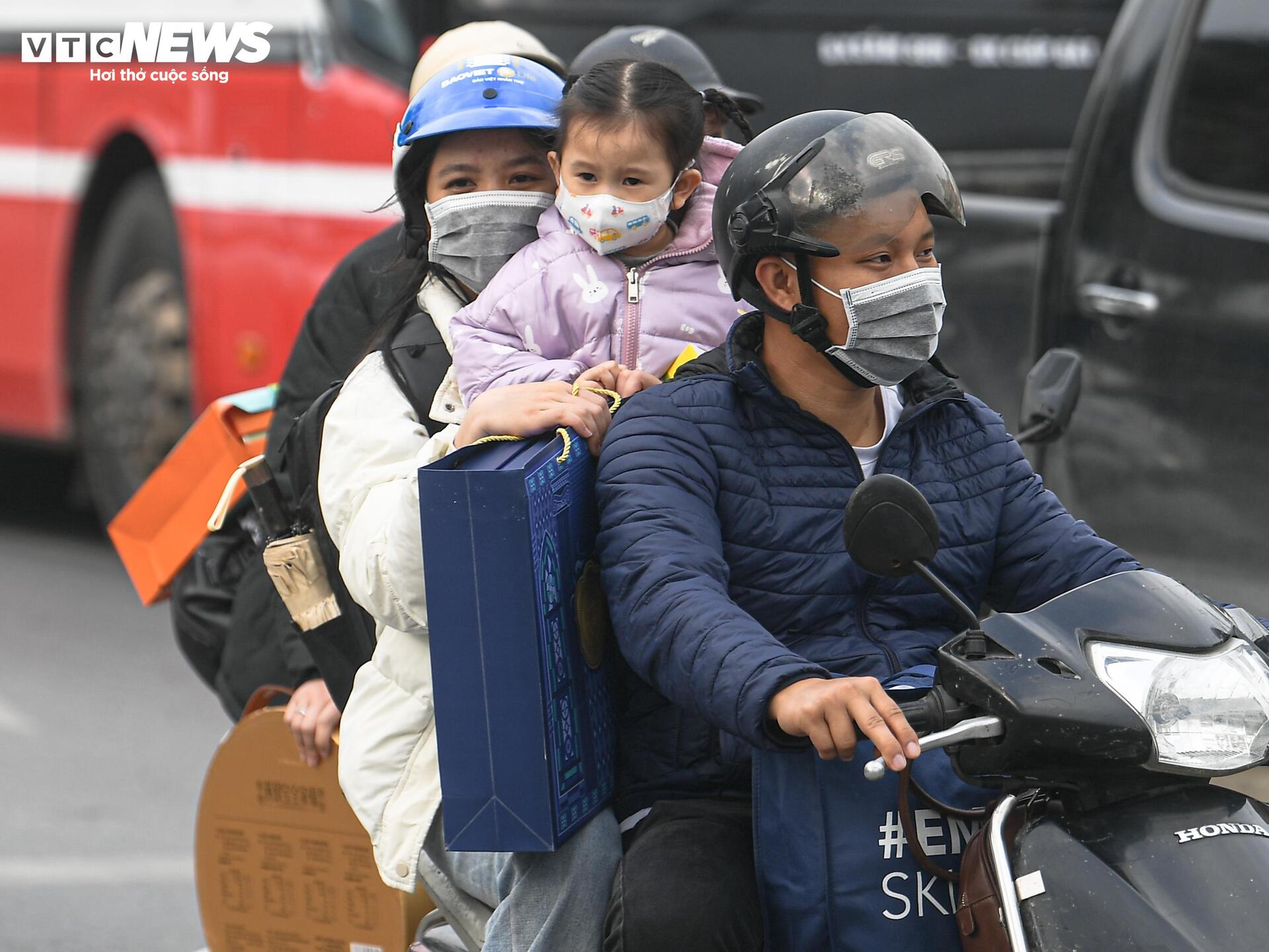 Trẻ nhỏ ngủ gục trên xe máy theo cha mẹ rời Thủ đô về quê đón Tết
