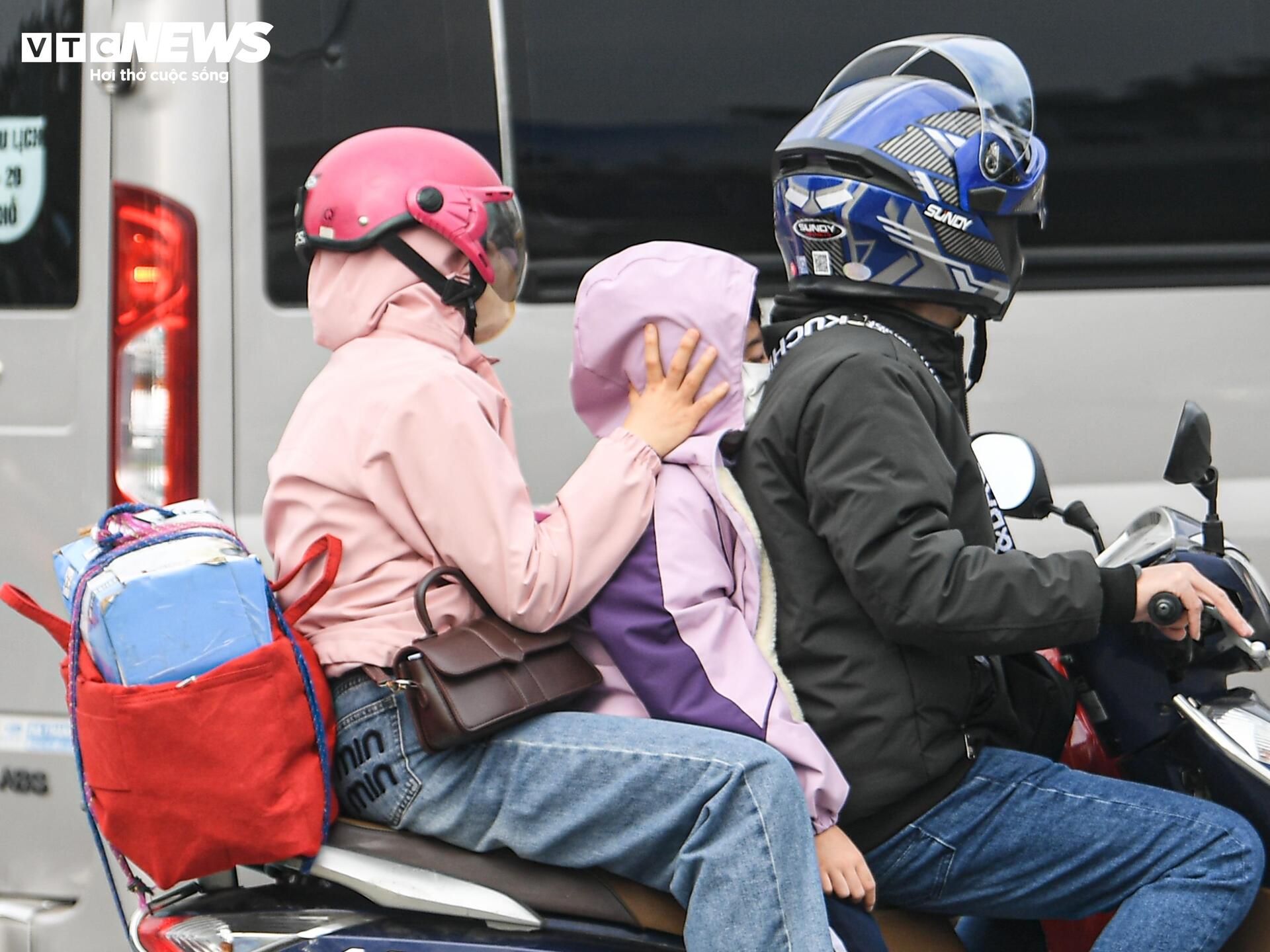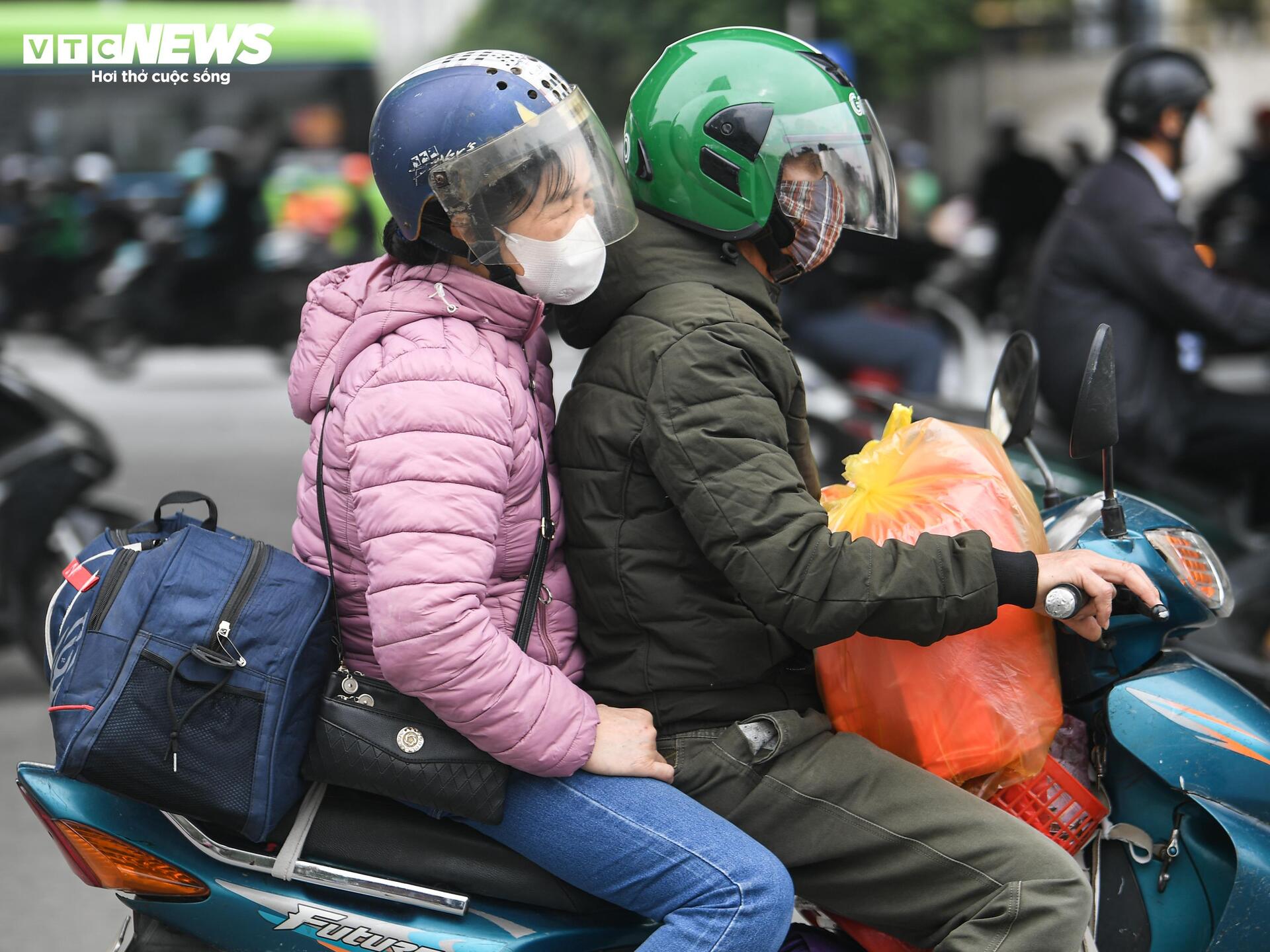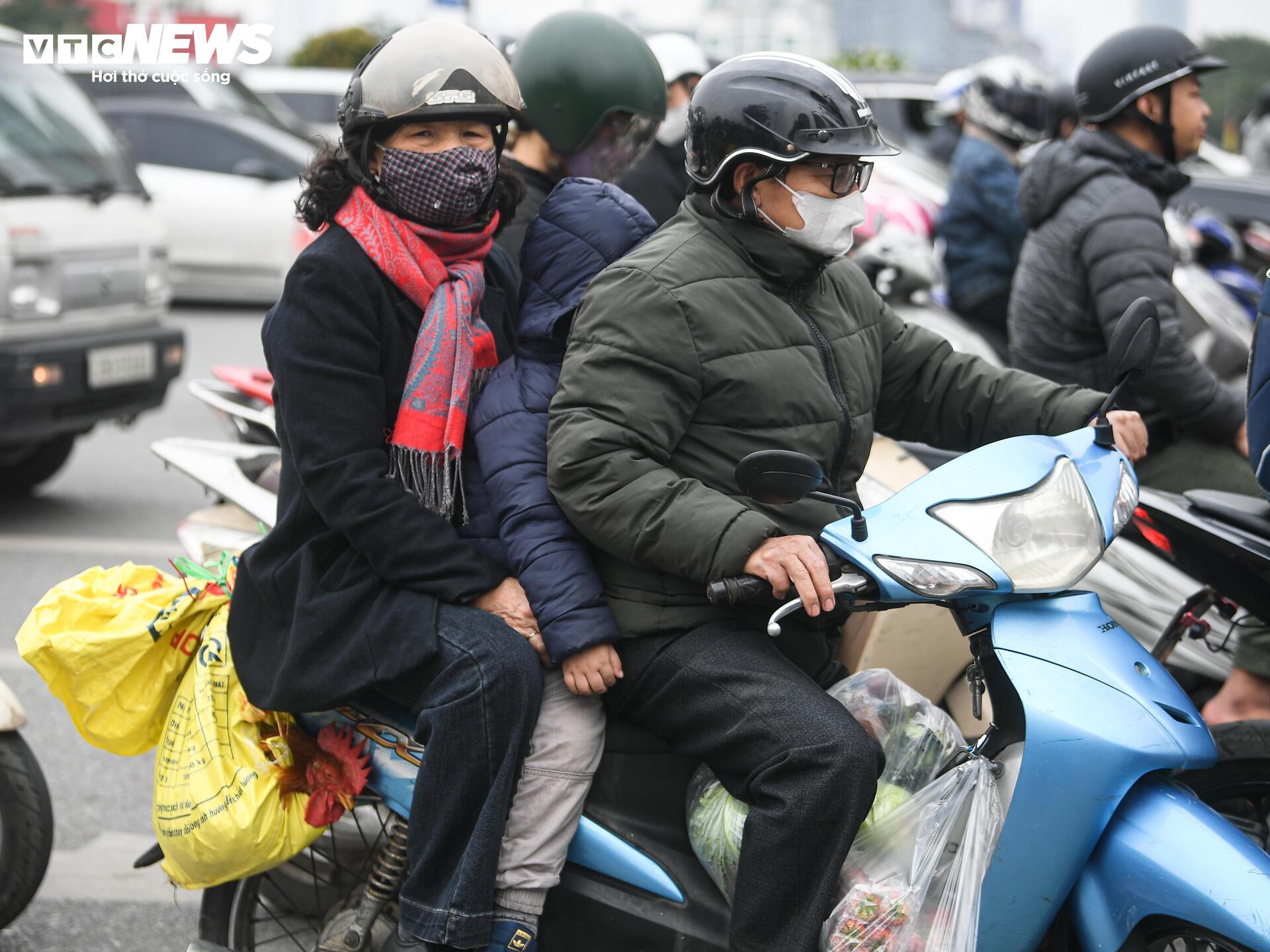 Trẻ nhỏ ngủ gục trên xe máy theo cha mẹ rời Thủ đô về quê đón Tết