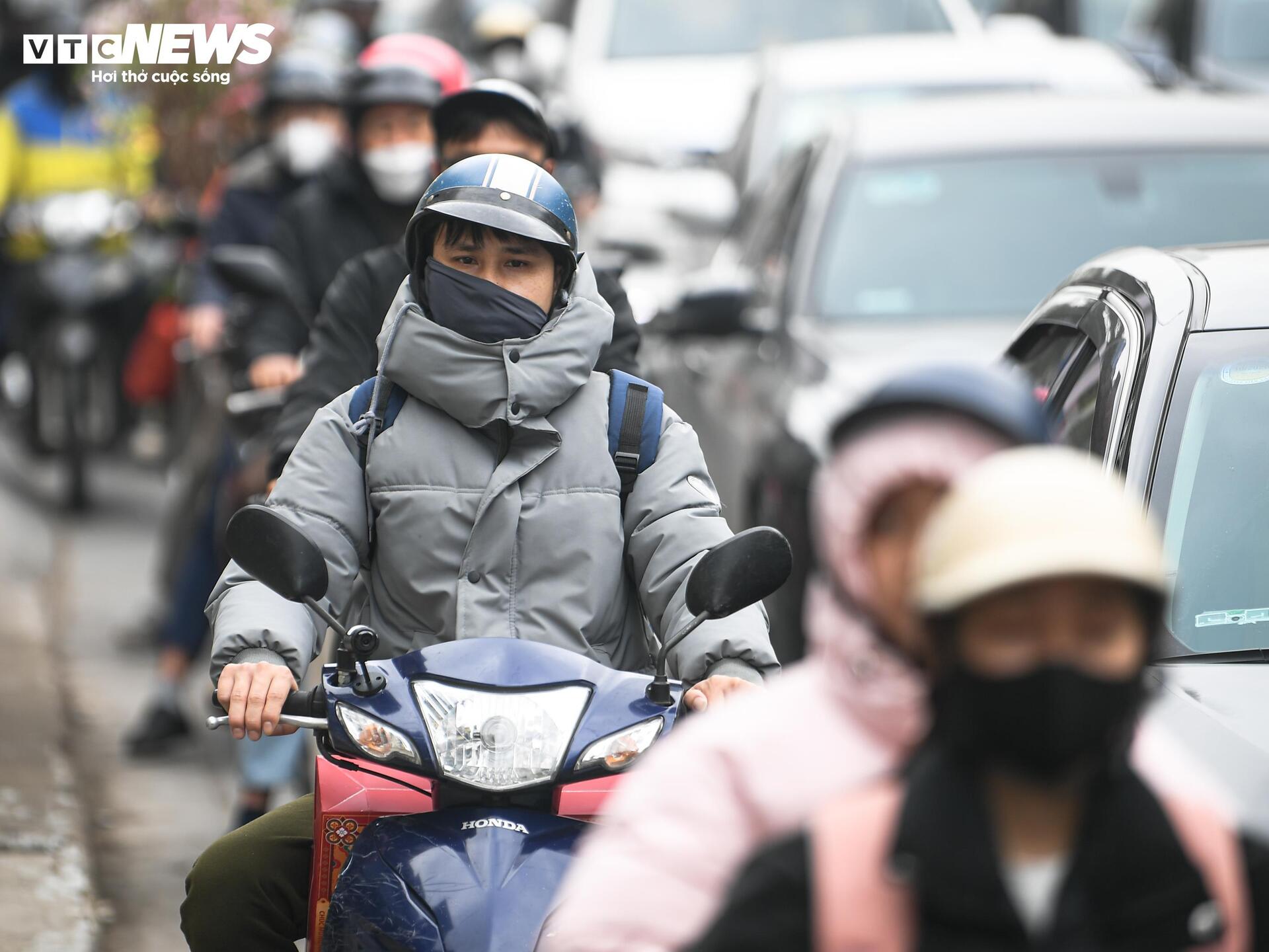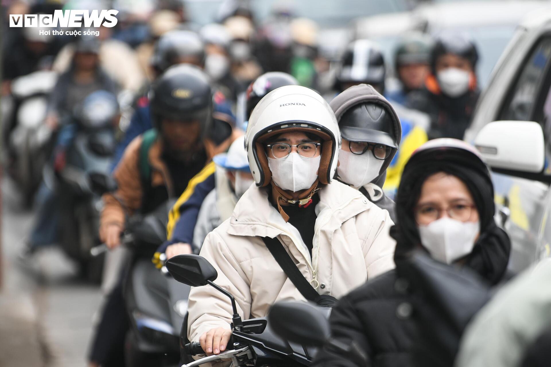 Chiều 13/2 cũng là ngày làm việc cuối năm Ất Tỵ, người dân ùn ùn về quê đón Tết khiến các cửa ngõ Hà Nội ùn tắc kéo dài, nhiều em nhỏ mệt mỏi ngủ gục trên xe máy.