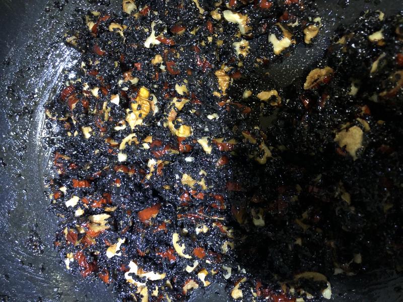 Nguyên liệu: 250g mè đen, 30g kỷ tử, 180g táo đỏ, 100g hạt óc chó, 250g mạch nha, 30g nước.