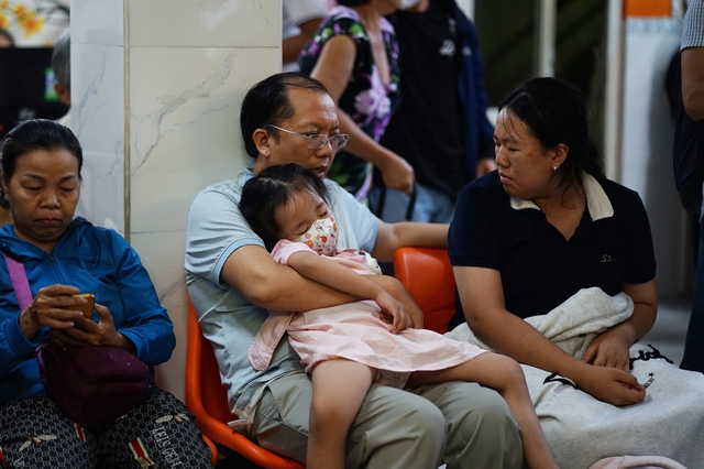 Em bé ngủ gục trong lòng cha mẹ trong lúc chờ xe lăn bánh, giữa không gian bến xe đông đúc những ngày cận kỳ nghỉ.