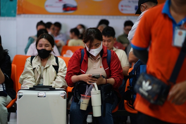 Khu vực chờ lên xe trở nên quá tải, đông đúc. Trẻ nhỏ mệt mỏi, ngủ gật trên ghế chờ; người lớn và sinh viên tay xách nách mang, mang theo hành lý cồng kềnh, di chuyển khó khăn giữa dòng người đông nghịt.