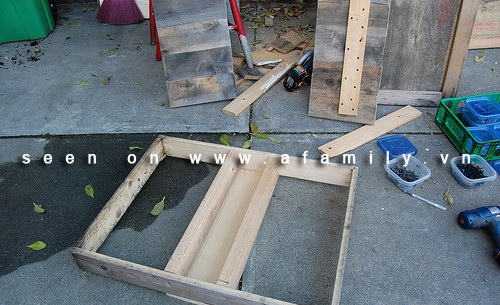 Sau khi đóng khung cho mặt bàn, bạn nên đóng đế cho phần giữa của mặt bàn để trồng cây. Bạn hãy khoan những lỗ nhỏ phía dưới để khi tưới nước, lượng nước thừa sẽ dễ dàng thoát ra ngoài.