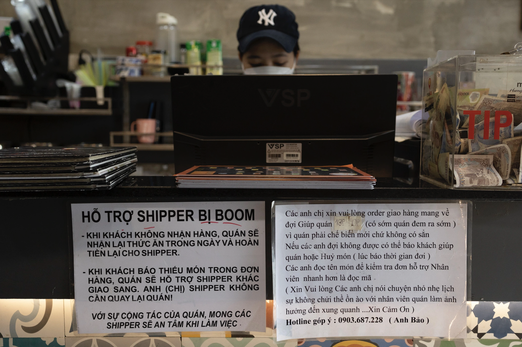 Ngay quầy thu ngân của các hàng quán, hàng loạt biển treo với nội dung dành cho shipper khiến nhiều người ấm lòng.