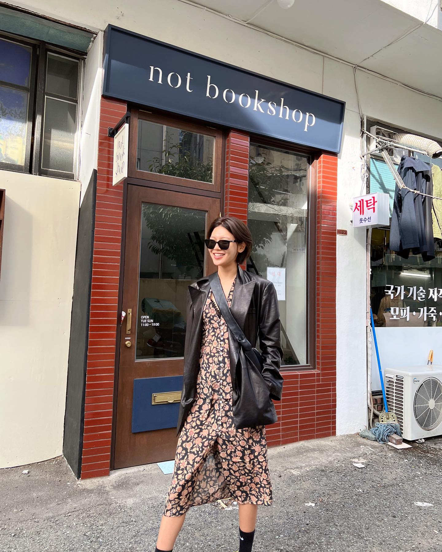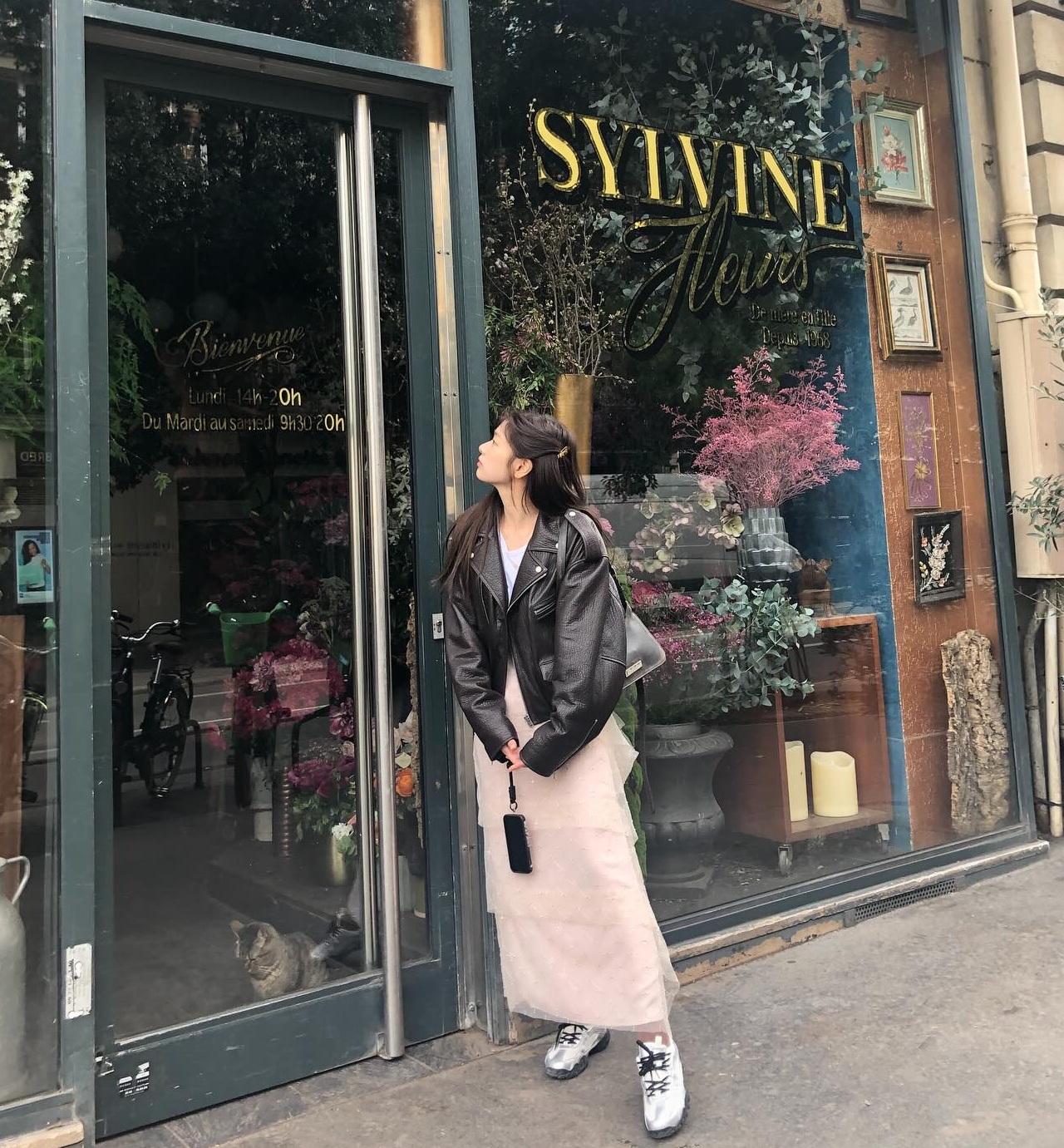 Áo khoác da vốn mang cảm giác mạnh mẽ và chất ngầu, nhưng khi kết hợp cùng váy, tổng thể lại trở nên mềm mại và trẻ trung hơn rất nhiều. Các sao Hàn thường chọn áo khoác da dáng lửng hoặc dáng biker để tạo sự cân bằng cho phần thân trên, giúp vóc dáng trông gọn gàng.