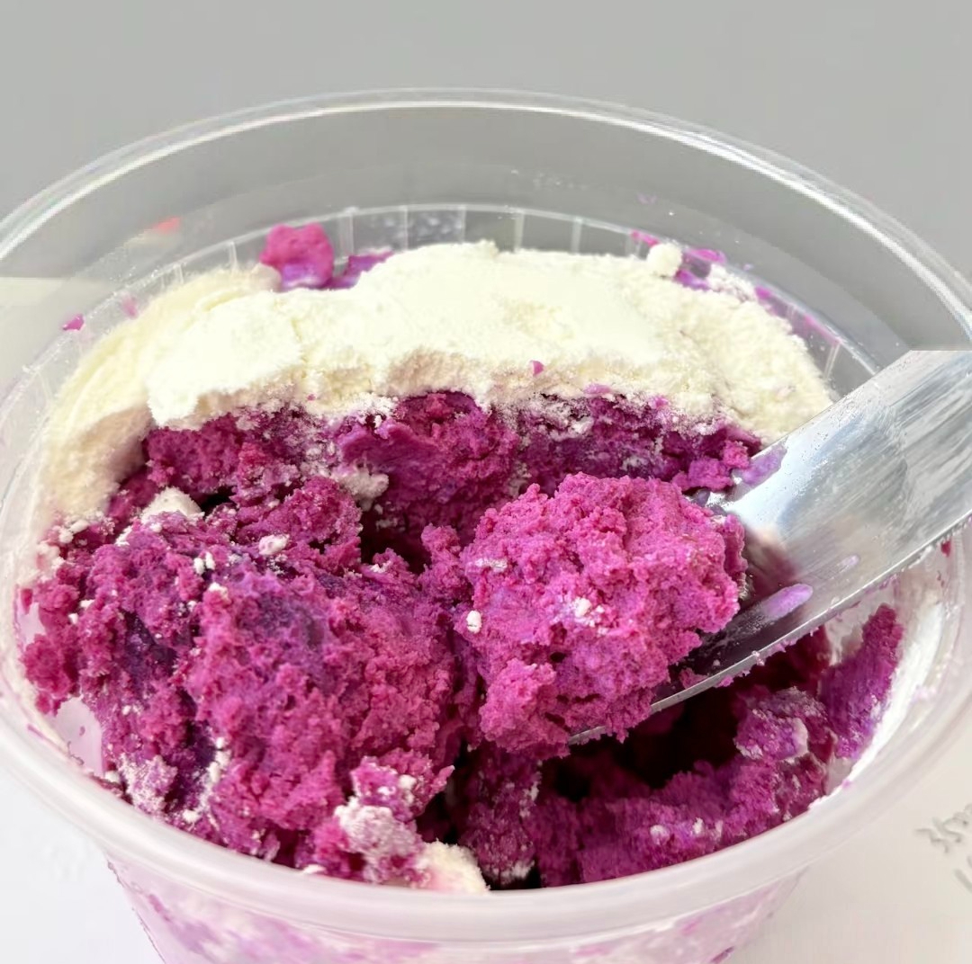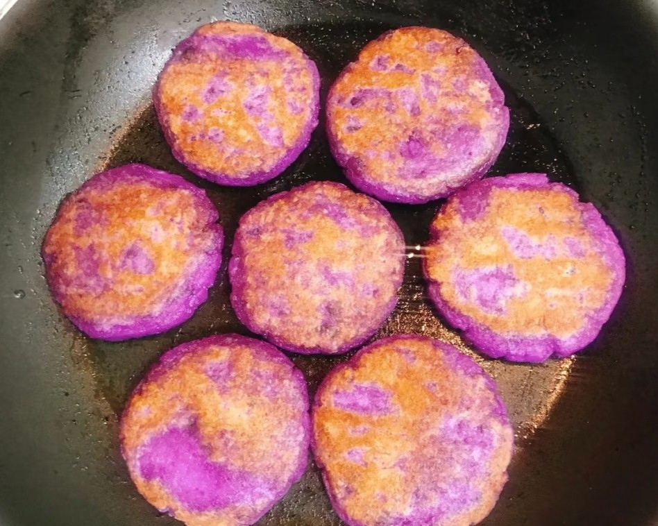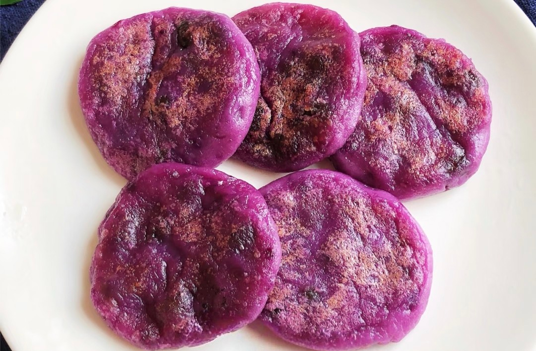 Nếu thích cảm giác giòn cạnh dẻo trong, hãy thử bánh khoai tím bột nếp áp chảo. Khoai hấp nghiền mịn, trộn cùng lượng bột nếp tương đương và chút đường cho vừa vị, nhào đến khi bột mượt.