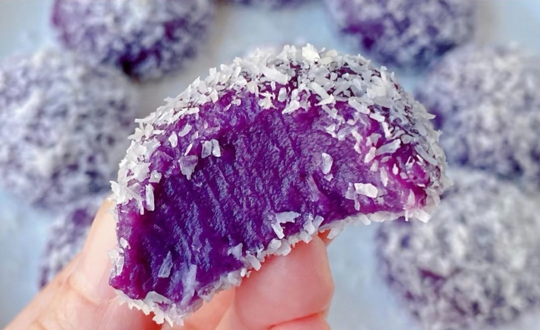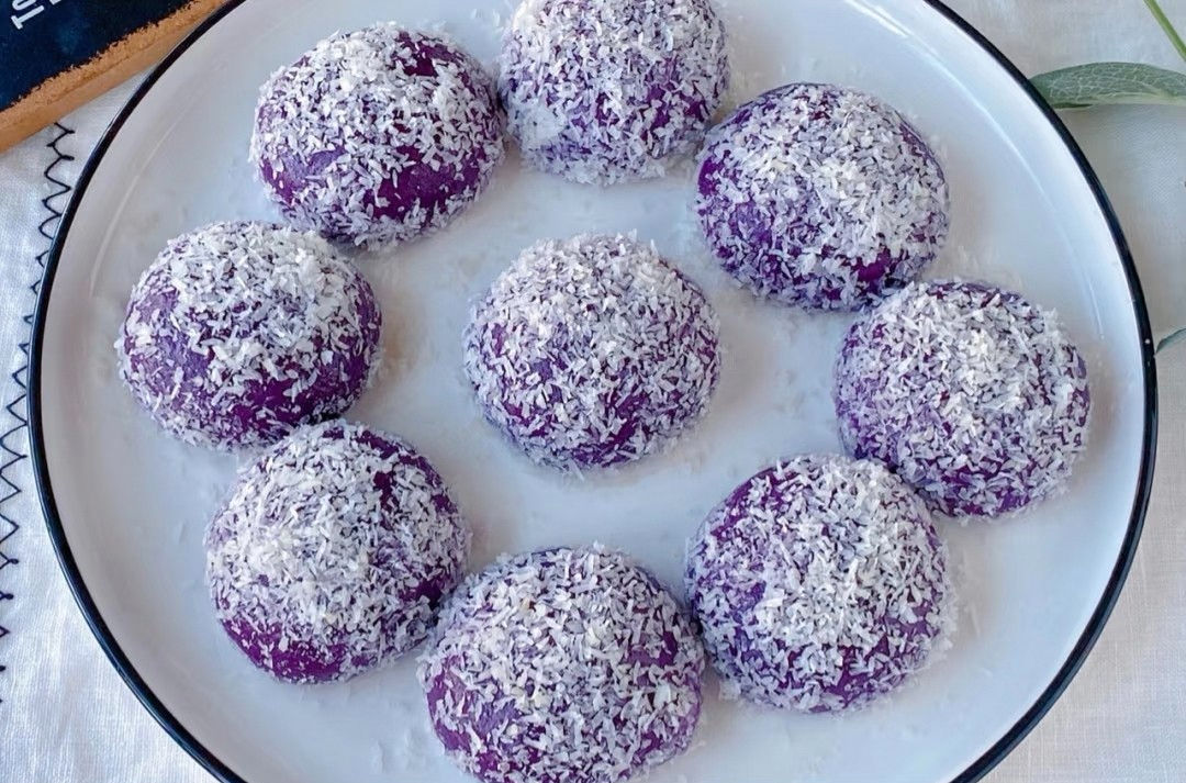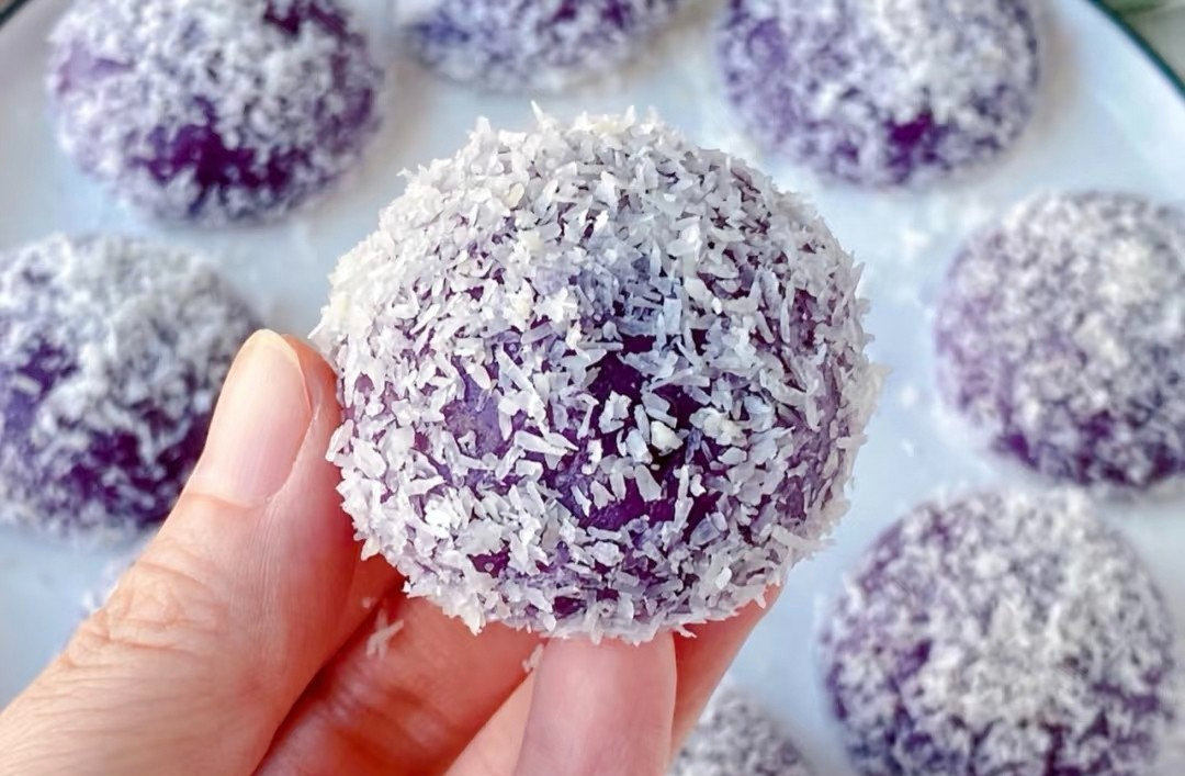 Khoai mỡ tím khi hấp chín có chất bột dẻo và vị ngọt thanh. Nhờ thế, nó phù hợp để nấu món ít dầu và cũng không kén bạn đồng hành. Công thức đầu tiên là những viên khoai phủ dừa thơm ngậy.