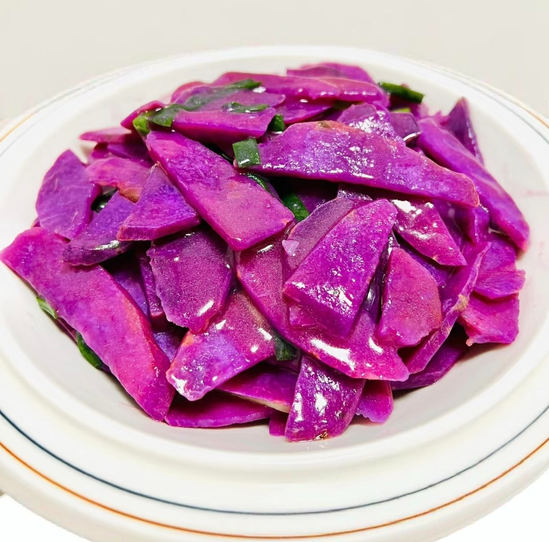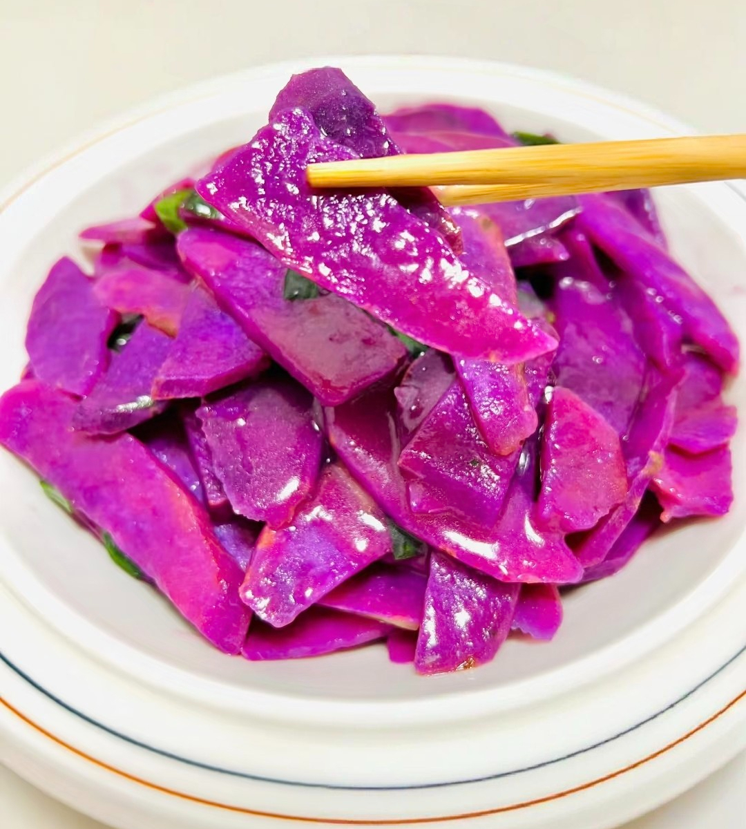 Đổi sang món mặn nhanh tay là khoai tím xào. Bí quyết để khoai giữ màu đẹp là chần qua nước sôi trong khoảng một phút rồi vớt ra để ráo. Phi thơm tỏi, cho khoai và vài miếng ớt chuông xanh đỏ vào đảo lớn lửa.