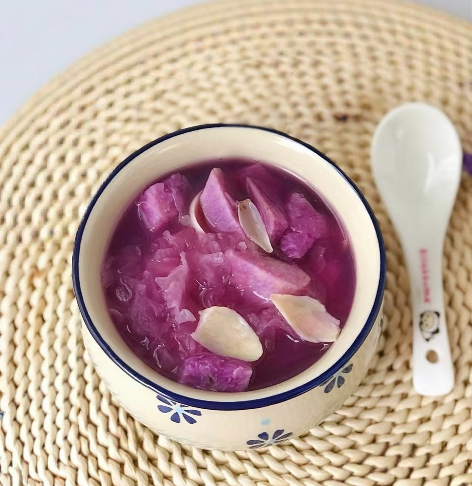 Món chót là chè khoai tím nấu cùng ngân nhĩ và bách hợp tươi khô, món tráng miệng thường được ví như “yến sào bình dân”. Ngân nhĩ ngâm nở, xé nhỏ rồi nấu với nhiều nước đến khi ra chất keo trong. Thêm khoai tím cắt hạt lựu và cánh bách hợp, nấu thêm mười lăm phút. Cuối cùng cho đường phèn và một nắm kỷ tử, chờ đường tan là tắt bếp. Chén chè sánh, nhẹ nhàng thơm mát, hợp cho những ngày hanh khô.