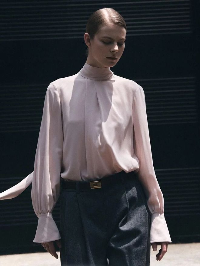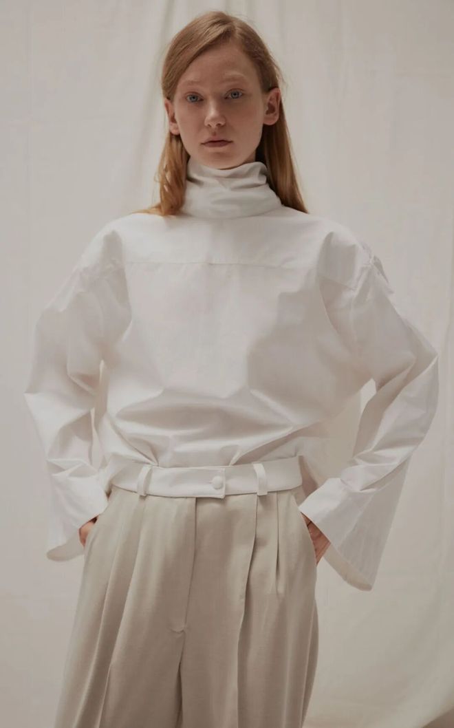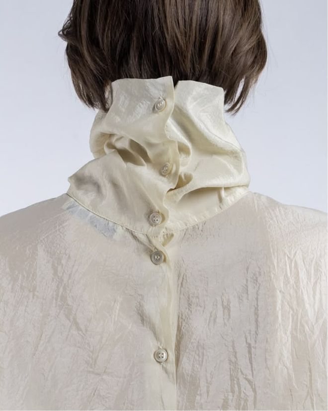 Nói là mặc ngược không có nghĩa là bạn lôi chiếc áo cũ trong tủ ra rồi khoác từ sau ra trước đâu nhé. Đây là một dụng ý thiết kế đầy tinh tế, chịu ảnh hưởng từ phong cách áo cổ lọ (turtleneck) kiêu kỳ, kết hợp cùng những đường cắt may sắc sảo của sơ mi truyền thống. Bằng cách giấu đi hàng cúc quen thuộc ra sau lưng, đưa phần cổ và vai áo gánh vác sứ mệnh tạo điểm nhấn ở phía trước, chiếc áo quen thuộc bỗng chốc khoác lên mình một nhịp điệu hoàn toàn mới, vừa lạ lẫm, tò mò lại vừa nữ tính đến nao lòng.