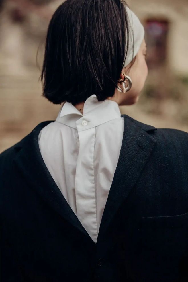 Điều quan trọng là phần cổ này không hề ẻo lả hay rủ xuống buông thõng, nó vẫn giữ được cái "cốt cách", cái nếp gấp dứt khoát của một chiếc sơ mi chuẩn mực. Thậm chí, nhiều mẫu áo còn cách điệu phần cổ sau nhô cao hẳn lên thành dạng cổ tàu mở rộng, tạo hiệu ứng thị giác giúp gương mặt trông nhỏ nhắn và thanh thoát hơn rất nhiều.