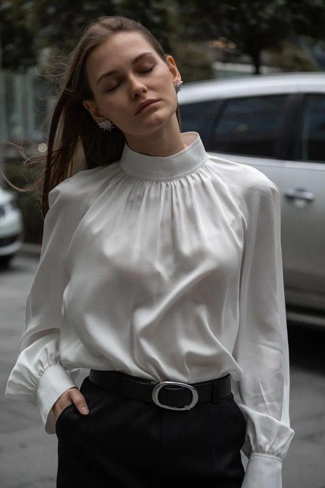 Còn nếu bạn là một nữ cường nhân nơi công sở, hãy tìm đến chất liệu cotton hoặc vải poplin dày dặn. Nhờ đặc tính đứng form, những chất liệu này sẽ biến chiếc áo thành một tác phẩm điêu khắc thu nhỏ, đường nét rành mạch, dứt khoát. Nhưng dù chọn chất liệu nào đi chăng nữa, chị em nhất định phải nằm lòng một quy tắc sống còn: Tuyệt đối không để phần cổ áo bị đổ gục hay nhăn nhúm. Một khi phần cổ mất đi độ đứng dáng, toàn bộ ý đồ thiết kế sang chảnh sẽ tan biến, khiến tổng thể trở nên luộm thuộm và thiếu sức sống ngay lập tức.