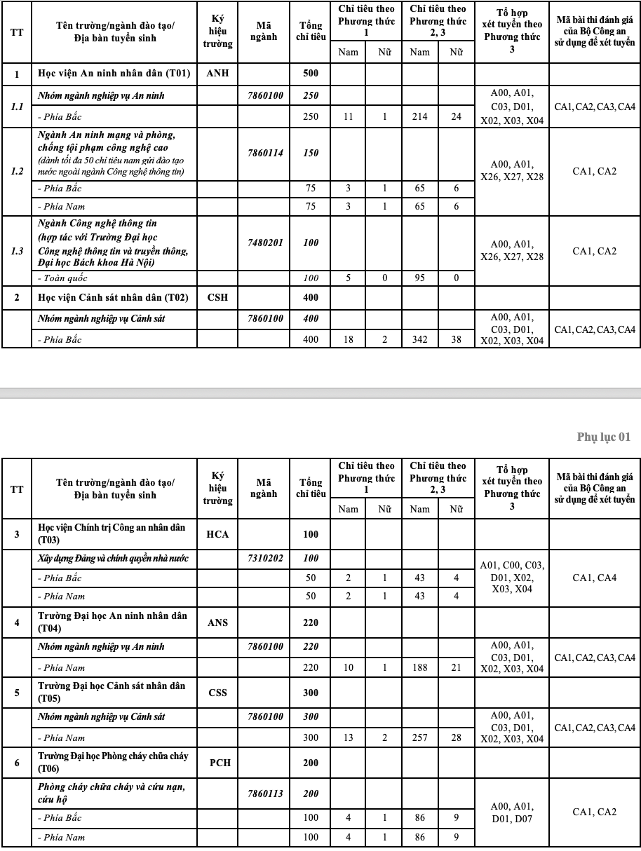 Theo hướng dẫn tuyển sinh của Bộ Công an, năm nay các trường sử dụng ba phương thức xét tuyển gồm: tuyển thẳng theo quy chế của Bộ Giáo dục và Đào tạo và Bộ Công an; xét kết hợp bài thi đánh giá của Bộ Công an với chứng chỉ ngoại ngữ quốc tế; và xét kết hợp điểm thi tốt nghiệp THPT với bài thi đánh giá của Bộ Công an.