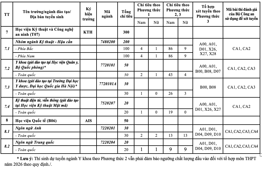 Năm 2026, tổng chỉ tiêu tuyển sinh của tám trường công an là 2.070 sinh viên đại học chính quy. Trong đó, 1.870 chỉ tiêu đào tạo trình độ đại học tại các học viện, trường Công an nhân dân và 200 chỉ tiêu hợp tác đào tạo trình độ đại học tại các cơ sở đào tạo ngoài ngành.
