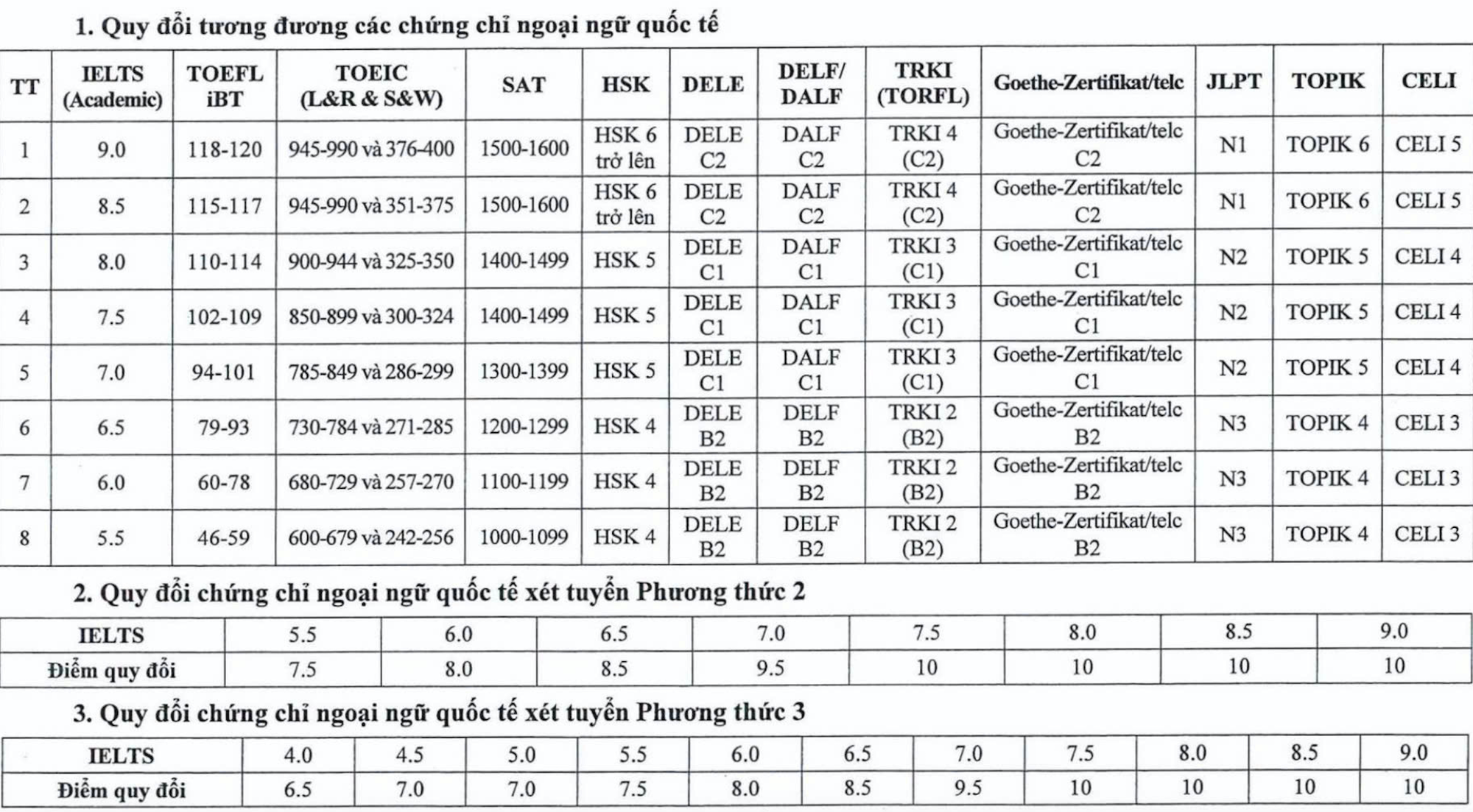 Nếu thí sinh xét tuyển bằng phương thức 2, chỉ cần chứng chỉ IELTS 5.5 trở lên sẽ được quy đổi thành 7,5-10/10 điểm.