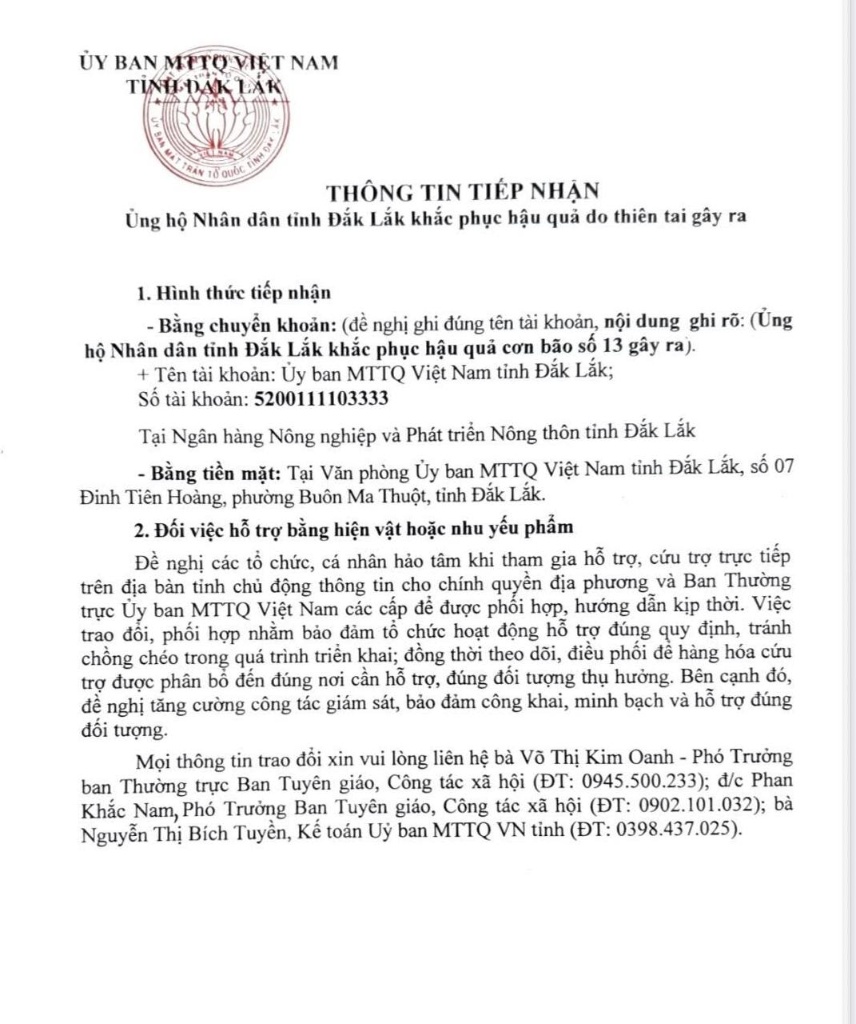 Nội dung chuyển khoản: “Ủng hộ Nhân dân tỉnh Đắk Lắk khắc phục hậu quả cơn bão số 13 gây ra”