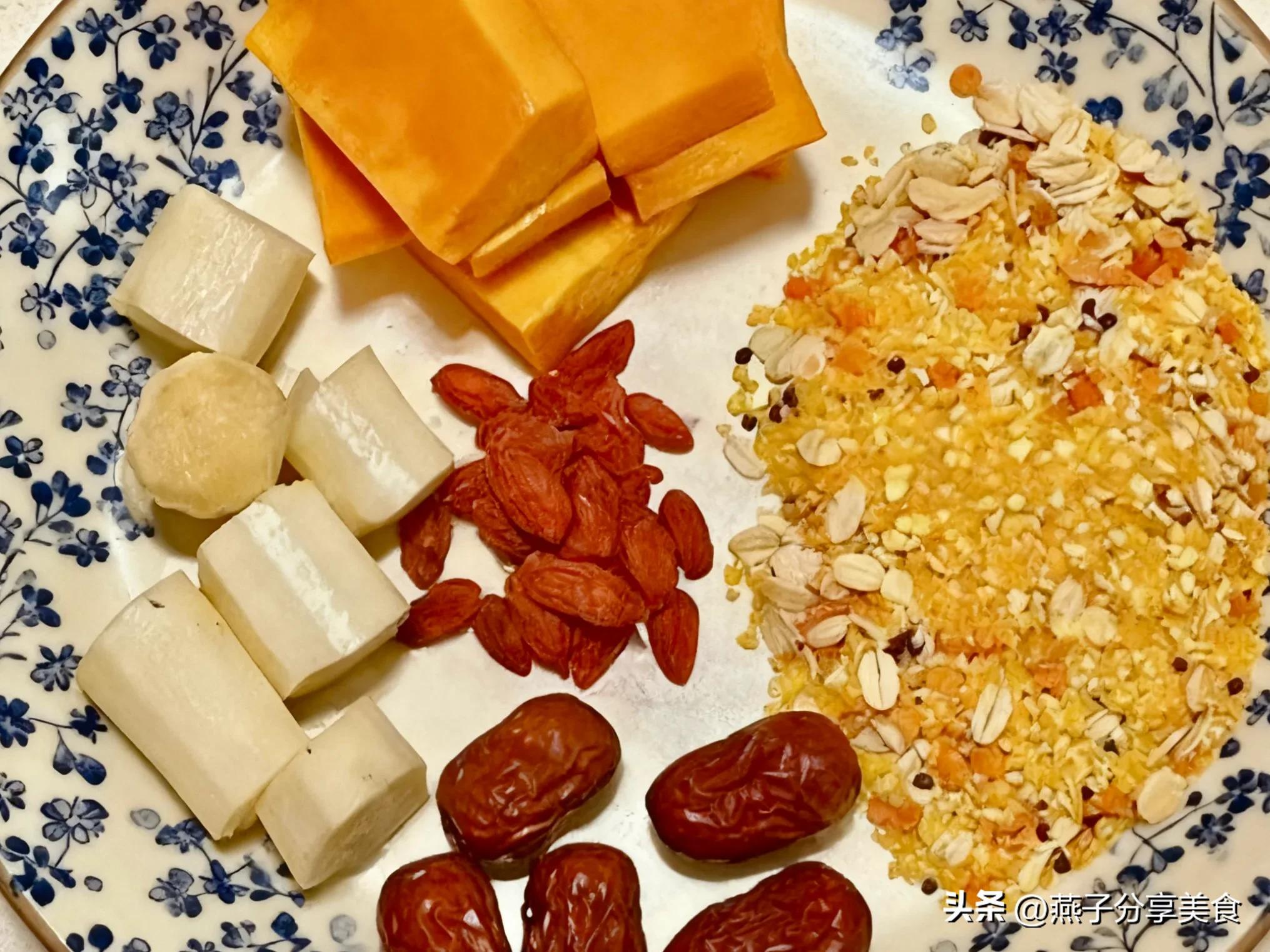 Nguyên liệu để nấu cháo ngũ cốc, bí đỏ và củ mài