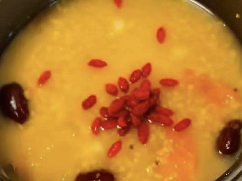 Bước 2: Tiếp theo, cho củ mài vào và tiếp tục nấu trong 10-15 phút, cho đến khi mềm, bở, dễ tan khi chạm nhẹ. Cuối cùng, cho quả kỷ tử đã rửa vào và thêm chút đường phèn, nấu thêm 5 phút nữa là món ăn hoàn thành. Một bát cháo ngũ cốc, bí đỏ và củ mài nóng hổi đã sẵn sàng. Món cháo bổ dưỡng này sẽ làm ấm cơ thể bạn từ đầu đến chân.