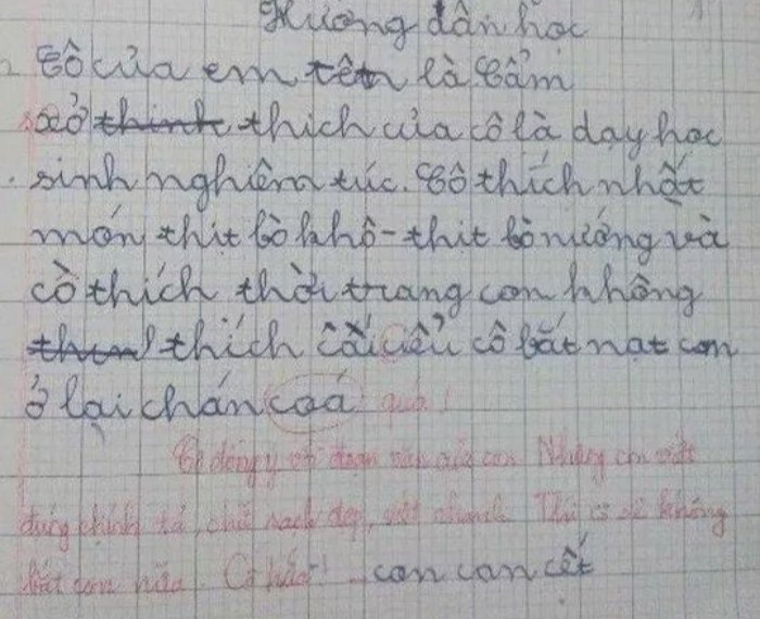 Em viết: “Cô thích nhất món thịt bò khô - thịt bò nướng và cô thích thời trang. Con không thích cái kiểu cô bắt nạt con ở lại, chán quá". Chỉ vài dòng ngắn ngủi nhưng nội dung lại chứa đựng đủ loại cảm xúc: vừa ngây thơ, vừa thật thà, lại có chút “bức xúc nhẹ” của một học sinh bị cô giáo giữ lại lớp. Nhiều người suy đoán rằng có lẽ em học sinh từng bị cô giữ lại lớp để làm trực nhật hoặc hoàn thành bài tập nên đã ghi thẳng cảm xúc vào bài văn.