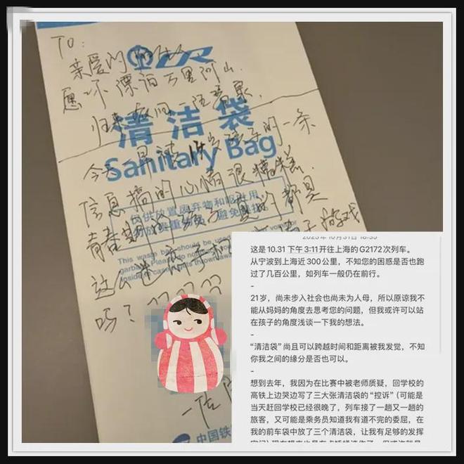 Không ngờ, hai ngày sau, Tiểu Phái - một cô gái 21 tuổi đã nhìn thấy chiếc túi giấy ấy. Nó gợi lại ký ức của cô về việc một năm trước, chính mình cũng từng viết tâm sự lên túi giấy vệ sinh trên tàu cao tốc. Và cô đã cầm bút, viết lời hồi đáp: “Chúng ta đều từng là những đứa trẻ, vừa ghét bị quản, nhưng lại vừa khao khát được yêu thương”.