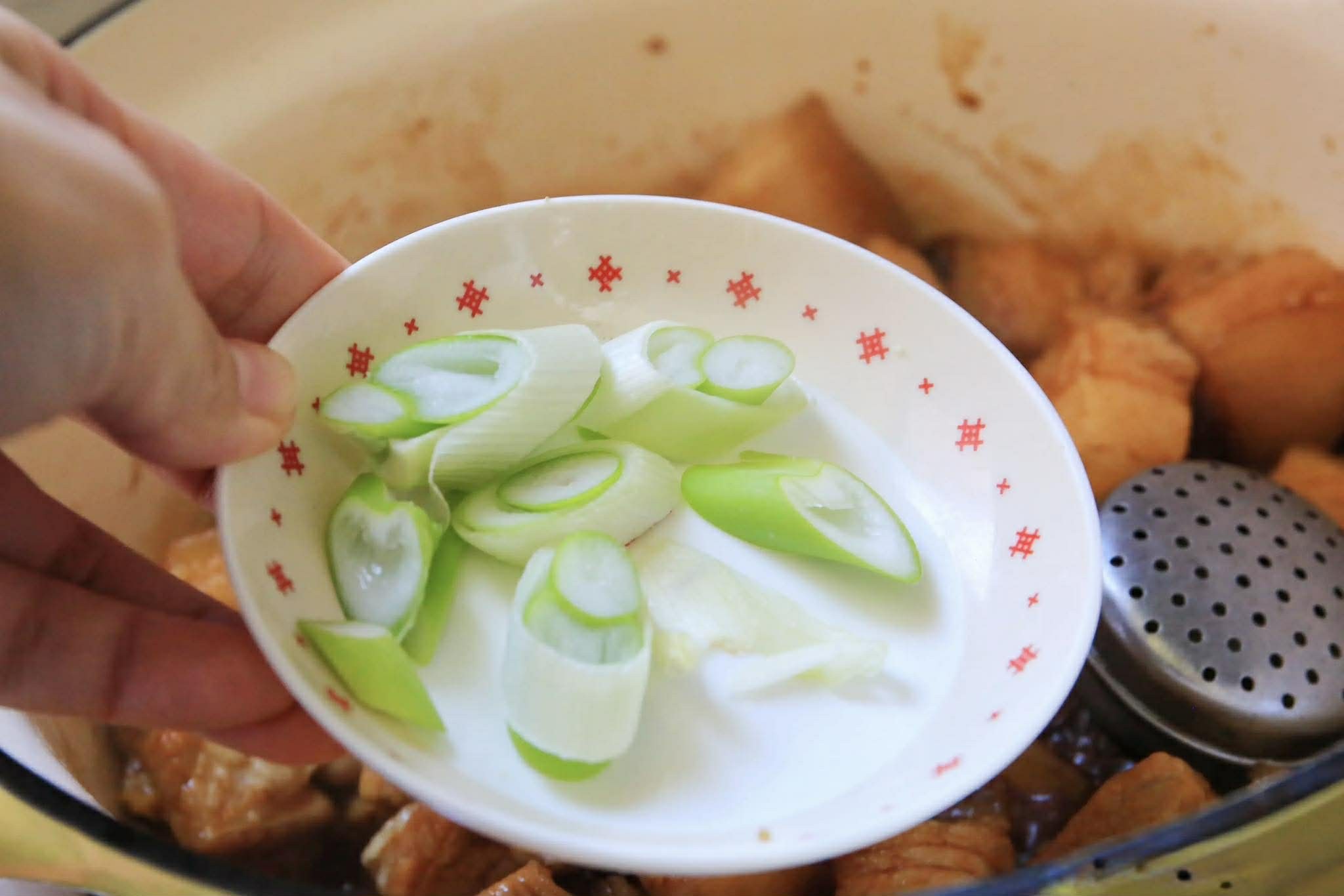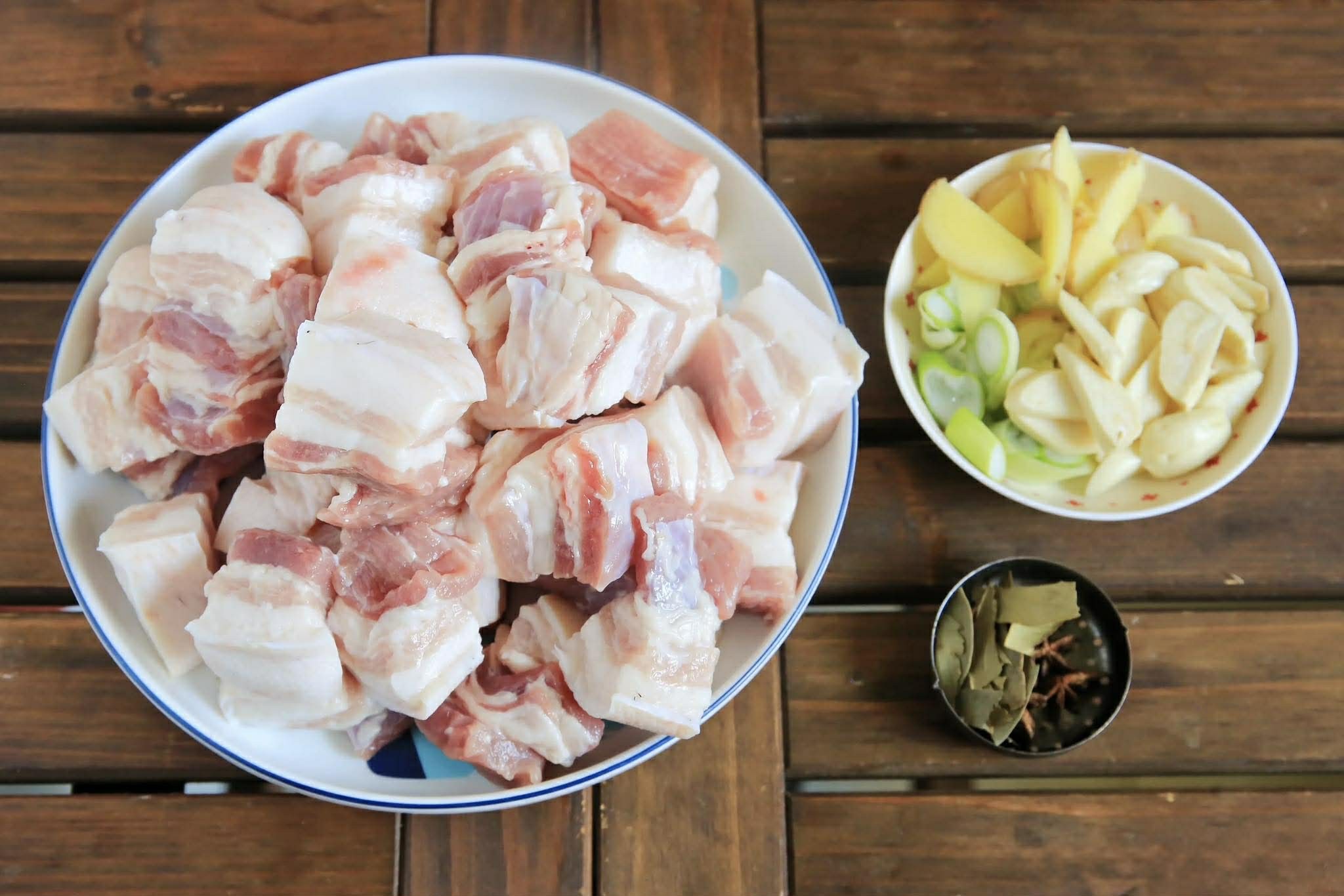 Bước 1: Rửa sạch hành lá và thái nhỏ. Rửa sạch và gọt vỏ gừng cùng tỏi và thái nhỏ. Cho hoa hồi, lá nguyệt quế vào túi lọc gia vị inox. Rửa sạch thịt ba chỉ sau đó cắt thành từng miếng vuông vừa phải. Ngâm thịt ba chỉ trong nước sạch khoảng nửa tiếng, sau đó rửa sạch lại, để ráo.