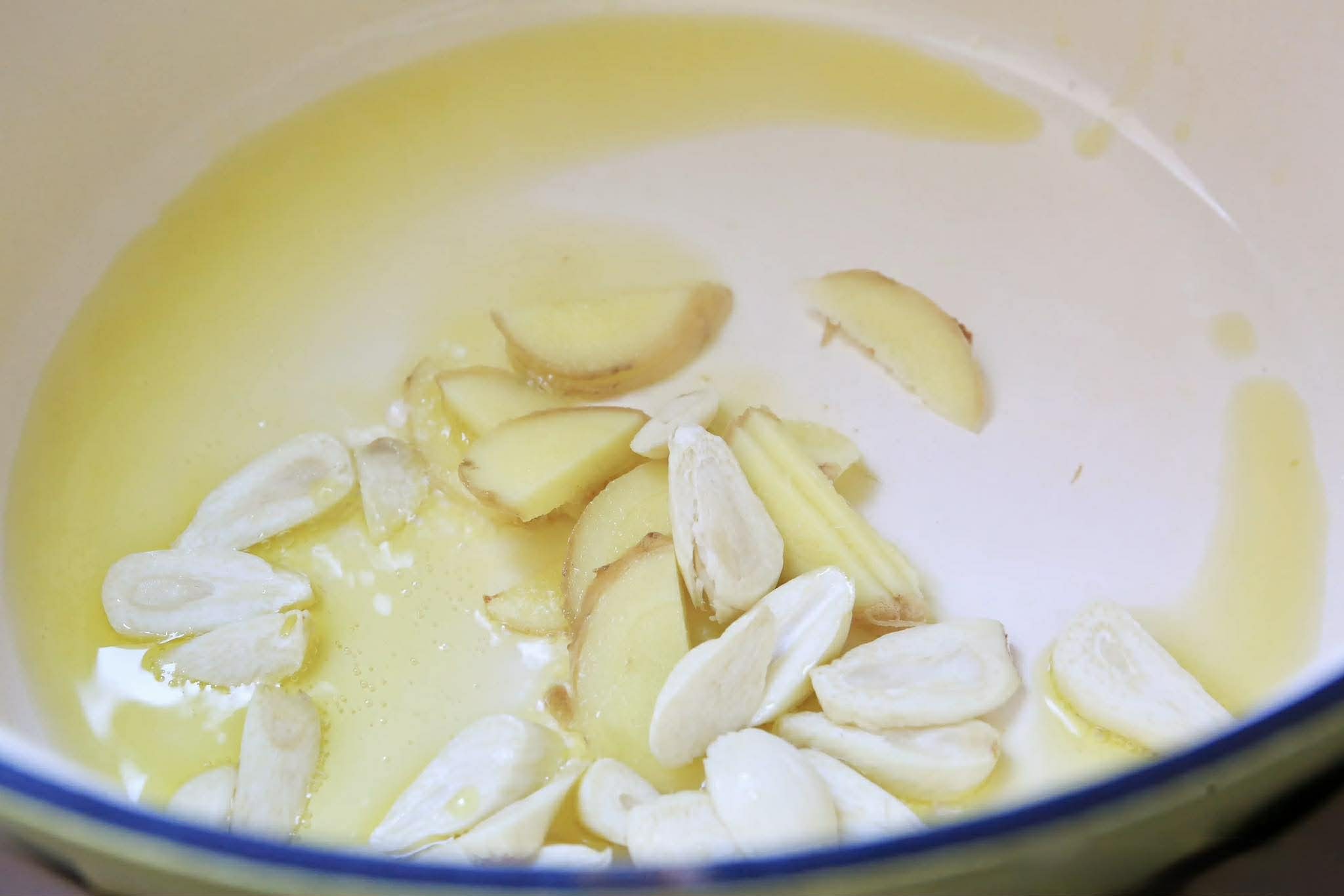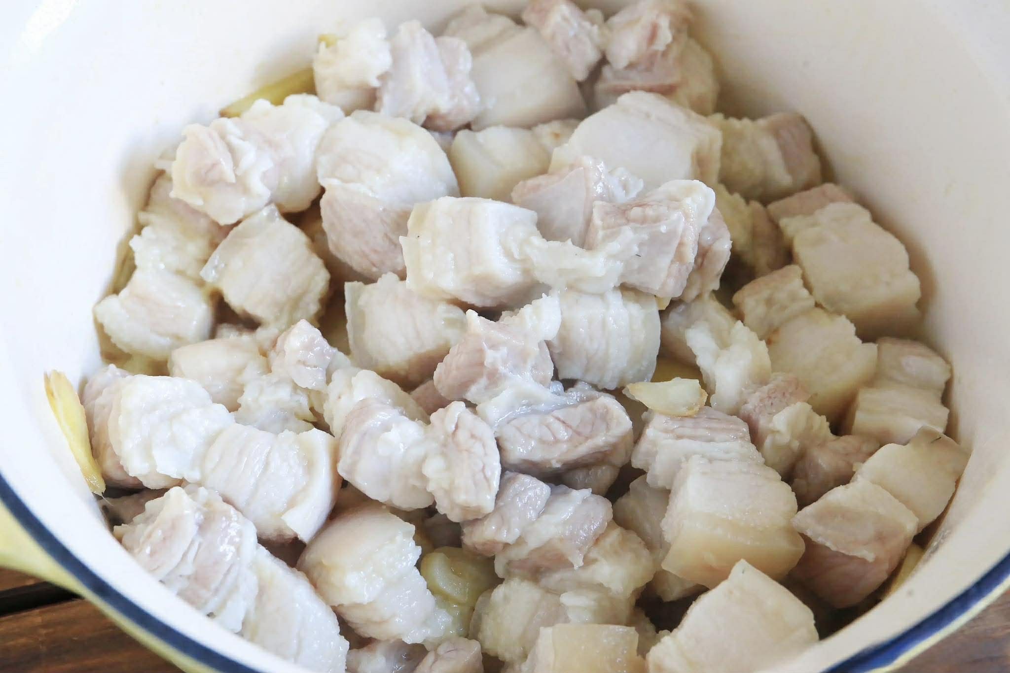 Bước 2: Cho một ít dầu vào nồi, đun nóng rồi thêm gừng và tỏi thái lát vào xào thơm. Thêm thịt ba chỉ đã sơ chế vào rồi xào nhanh cho đến khi đổi màu. Đổ rượu nấu ăn vào và tiếp tục xào nhanh tay. Cho thêm một lượng nước tương, nước tương đen vừa đủ và xào cho đến khi thịt ba chỉ thấm đều gia vị.