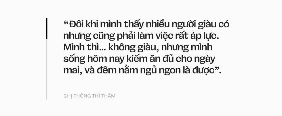 Chị Thông nói rằng, đôi khi, điều khiến chị buồn nhất là mình không được giỏi như người khác. "Mình không được học hành đến nơi đến chốn". Chị thì thầm. Nhưng rồi chị lại tự nhủ rằng, mọi thứ mình đang có đều là những may mắn hiếm có của một đời người. "Đôi khi mình thấy nhiều người giàu có nhưng cũng phải làm việc rất áp lực. Mình thì… không giàu, nhưng mình sống hôm nay kiếm ăn đủ cho ngày mai, và đêm nằm ngủ ngon là được".
