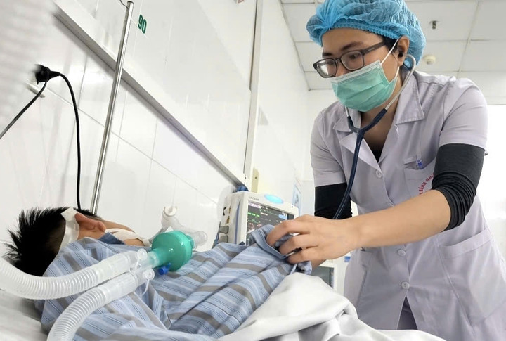 Tại Khoa Nhi, bệnh nhân nhập viện trong tình trạng nguy kịch: tăng tiết đờm dãi nhiều, xuất hiện các cơn thít thanh quản, gồng cứng toàn thân, điểm Glasgow chỉ còn 10–11, cho thấy ý thức suy giảm rõ rệt. Các bác sĩ buộc phải dùng thuốc an thần, đặt ống nội khí quản và cho thở máy. Đáng chú ý, vết chó cắn đã liền da, không còn dấu hiệu viêm nhiễm tại chỗ.