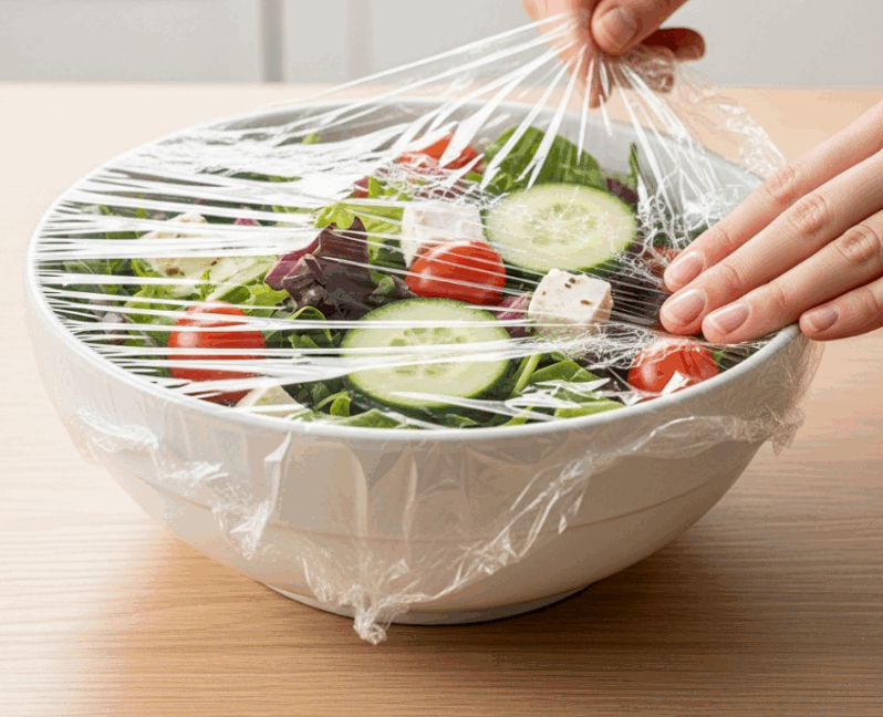 Màng bọc thực phẩm PE là vật dụng phổ biến trong gia đình. Nó mềm mại và an toàn, thích hợp để bọc các loại thực phẩm hàng ngày như trái cây, rau củ và thức ăn thừa. Có thể bảo quản an toàn trong tủ lạnh.