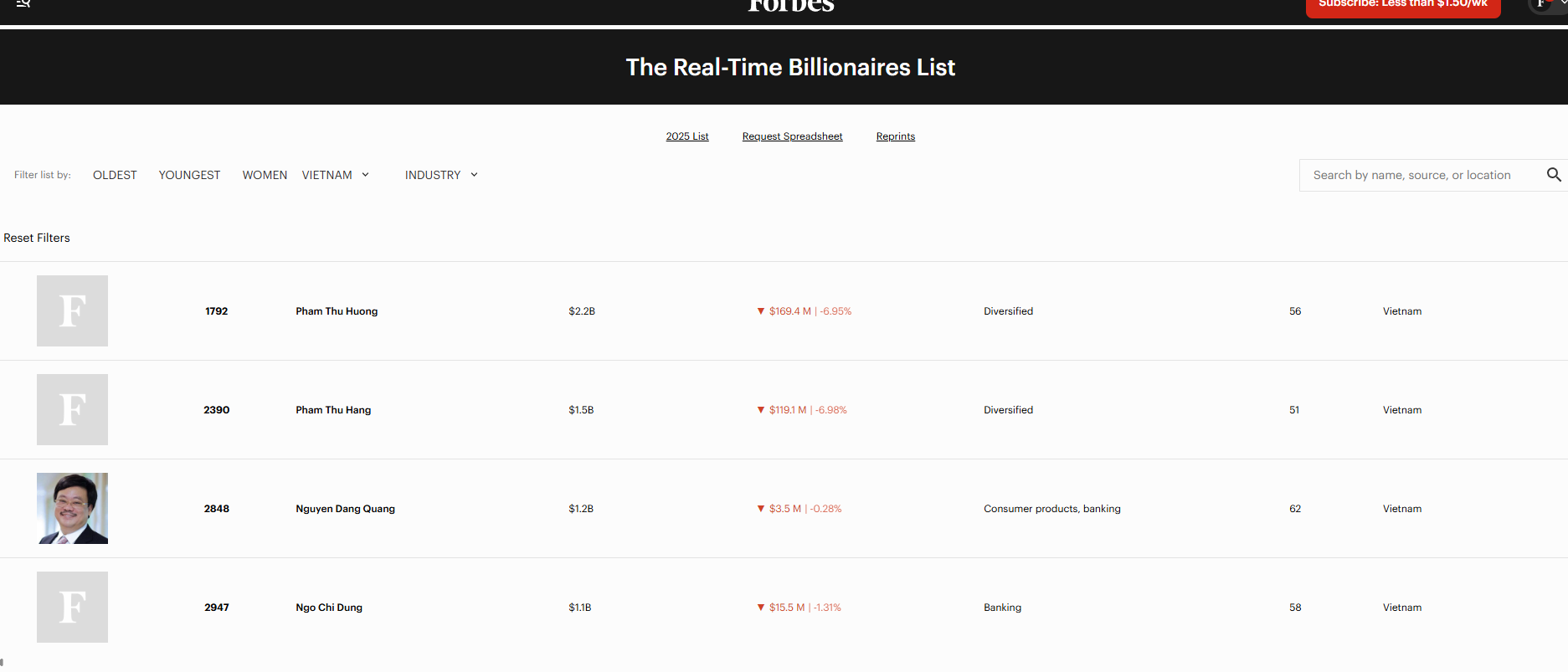 Bà Phạm Thu Hương, bà Phạm Thúy Hằng cùng ông Ngô Chí Dũng trong bảng xếp hạng tỷ phú theo thời gian thực - Ảnh: Forbes.