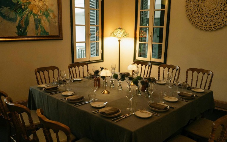 Không gian tại đây là sự giao thoa tuyệt vời giữa nét cổ điển của kiến trúc Pháp và sự ấm cúng, gần gũi của văn hóa Việt. Thực khách sẽ thích thú khi nhận ra những bộ gốm sứ được lựa chọn tỉ mỉ, mỗi chiếc đĩa, chiếc tách đều kể một câu chuyện về sự tỉ mỉ. Những bức tranh treo tường không chỉ để trang trí, mà chúng tạo nên một dòng chảy cảm xúc, kết nối thực khách với nghệ thuật.