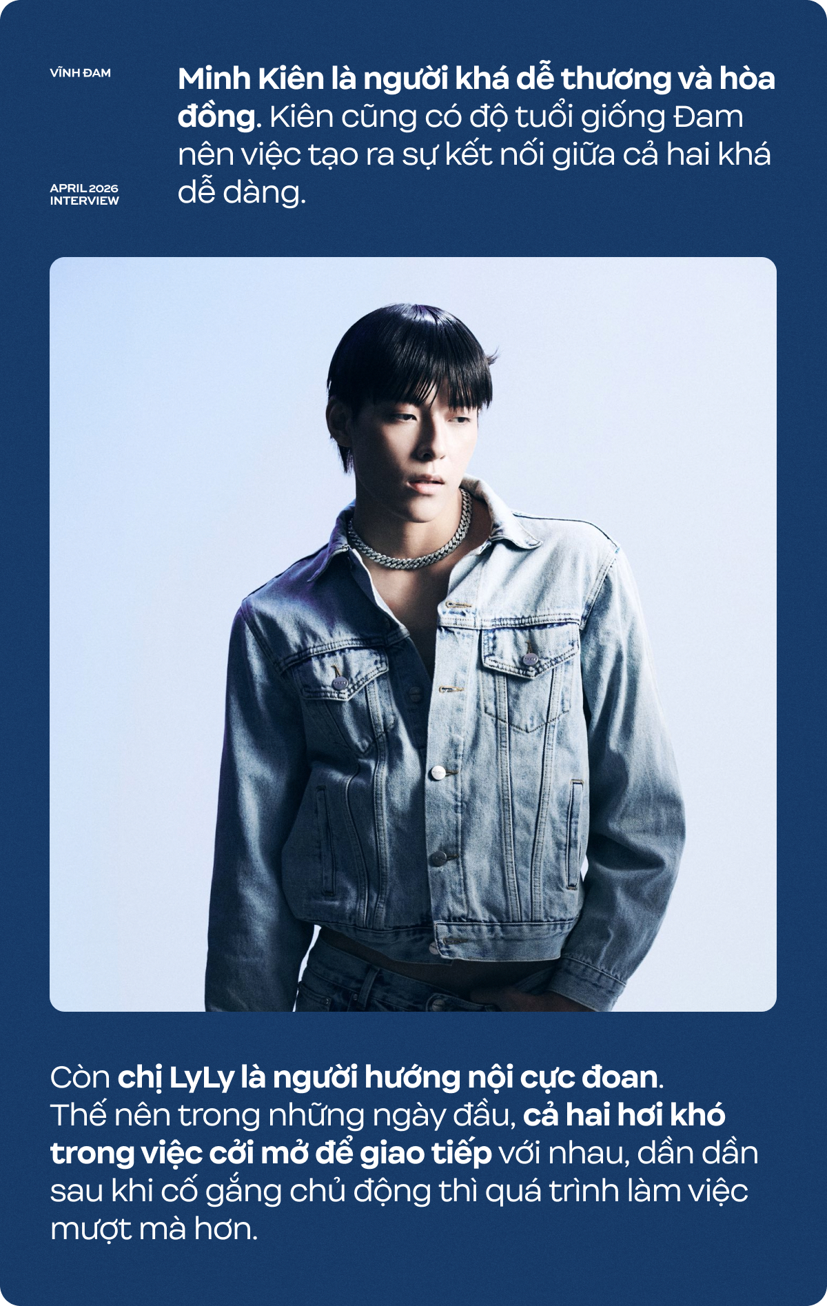 Minh Kiên là người khá dễ thương và hòa đồng. Kiên cũng có độ tuổi giống Đam nên việc tạo ra sự kết nối giữa cả hai khá dễ dàng. Còn chị LyLy là người hướng nội cực đoan. Tôi biết chị LyLy qua những bài hát và sau này khi làm việc chung, nói chuyện nhiều hơn mới biết chị rất lành tính nhưng hướng nội. Thế nên trong những ngày đầu quay, cả hai hơi khó trong việc cởi mở để giao tiếp với nhau, dần dần sau khi cố gắng chủ động thì quá trình làm việc mượt mà hơn. Sau khi kết thúc 2 dự án, Đam vẫn giữ được sự kết nối với các bạn diễn.