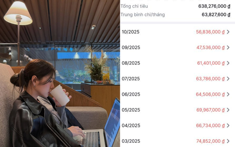 Bảng tổng chi tiêu theo từng tháng, từ tháng 1/2025 đến tháng 10/2025 do cô đăng tải. Trung bình mỗi tháng, gia đình chi tiêu khoảng 63,8 triệu đồng